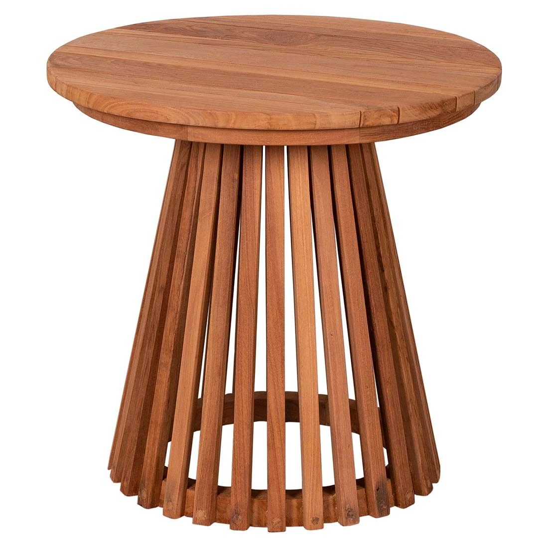 Sowohl die Tischplatte als auch das Gestell sind aus Teakholz gefertigt. Für ein stimmiges Gesamtbild erscheint die Platte in der Farbe Natur. Das Design des Beistelltischs ist klassisch rund.