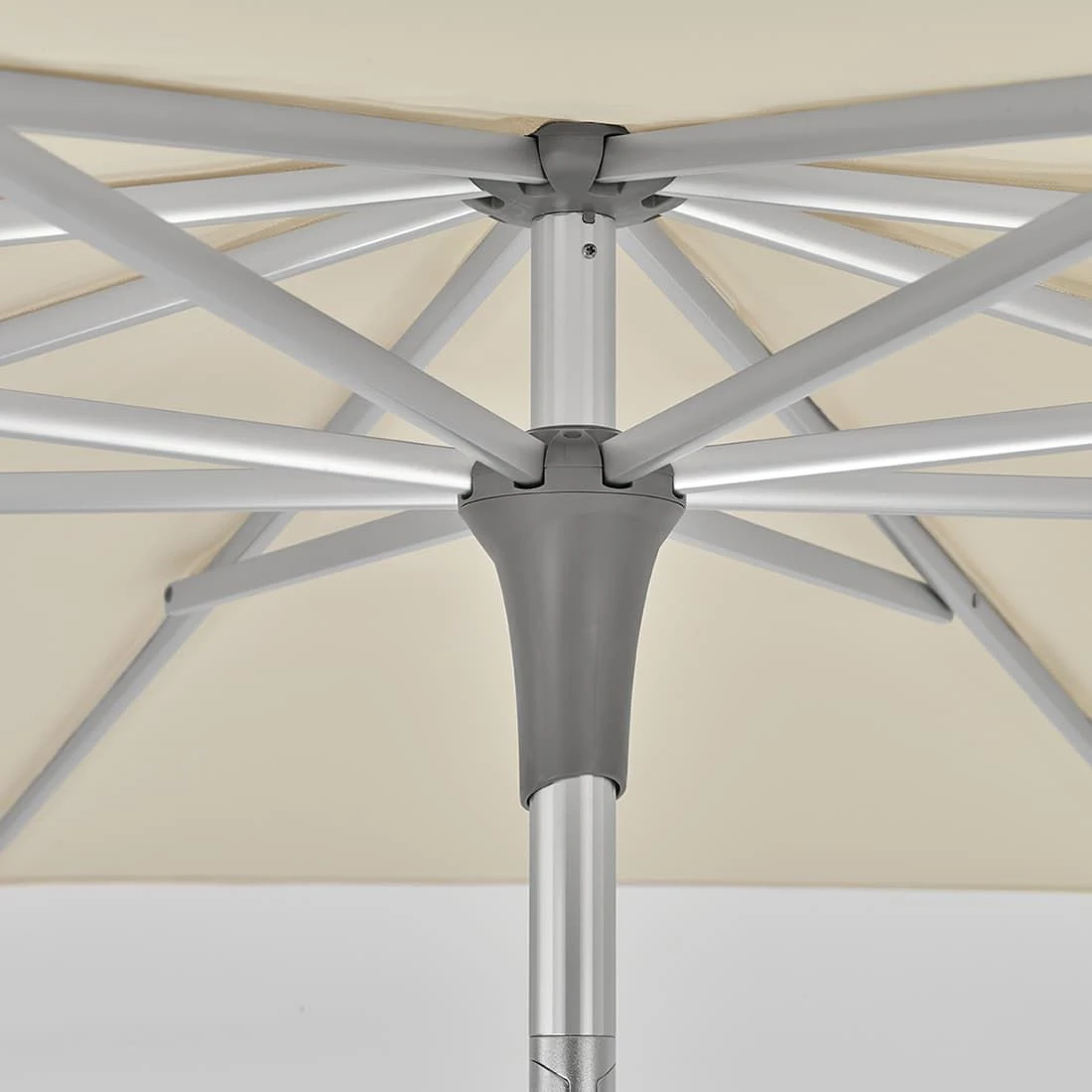 Material und Technik: Gestell und Streben sind aus Aluminium mit profiliertem Mast. Die stufenlose Höhenverstellung erfolgt durch die Bewegung des Unterstockes. Die Neigung des Schirmdaches lässt sich per Druckknopf am Kippgelenk unterhalb des Schirmdaches auslösen. Der Schirmbezug ist auswechselbar und selbstspannend, dank den flexiblen Strebenenden. Der Schirmstock hat einen Durchmesser von 35mm, wir empfehlen einen Schirmsockel ab 40kg.