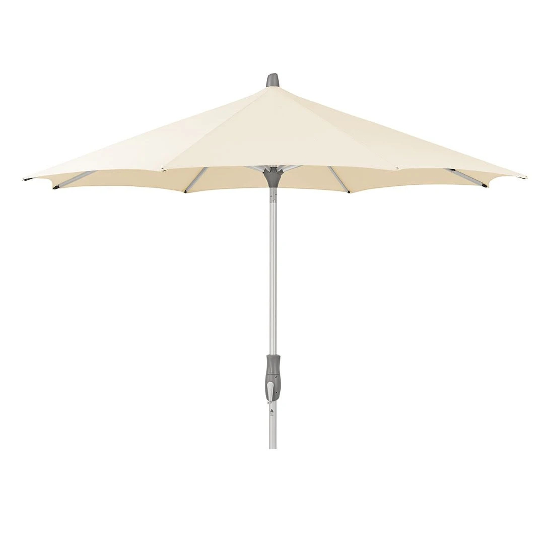 Material und Technik: Gestell und Streben sind aus Aluminium mit profiliertem Mast. Ein Kurbelantrieb sorgt für leichtes Öffnen des Schirms. Die Verstellung zur Neigung des Schirmdaches erfolgt mittels Drehrad oberhalb des Kurbelgehäuses. Der Schirmbezug ist auswechselbar und selbstspannend, dank den flexiblen Strebenenden.