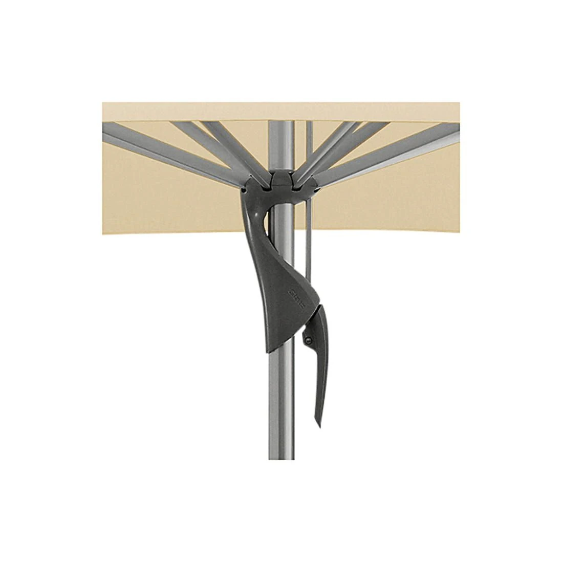 Bedienung: Einfach den Spannhebel nach unten ziehen und im Schieber einhängen. Durch das gegenläufige Servo-Prinzip gelingt dies mit minimalem Kraftaufwand. Eine Neigung des Schirmdaches ist bei diesem Modell nicht möglich.