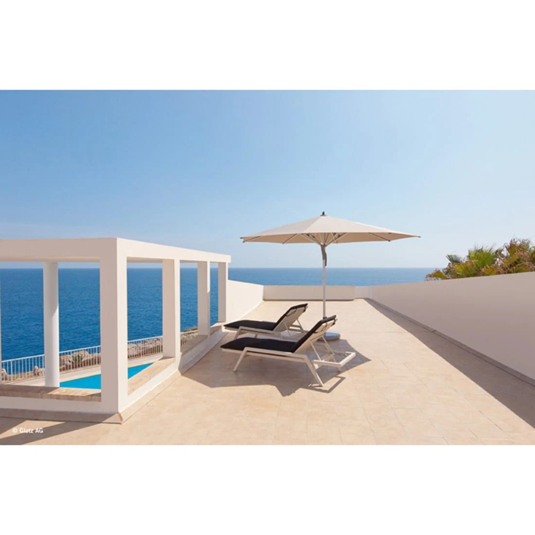 Material und Technik: Schrauben und Nieten sind aus Edelstahl (100% rostfrei). Die Gestellfarbe ist natureloxiert. Der Schirmbezug ist auswechselbar und selbstspannend, dank den flexiblen Strebenenden.
