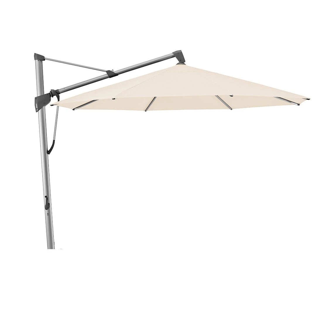 Bedienung: Sie öffnen und schliessen den SOMBRANO® S+ mit der abnehmbaren Handkurbel. Der Kurbelantrieb ist selbstarretierend. Mit der Lenkstange neigen Sie das Schirmdach auf beiden Seiten bis zu 54°. Der Freiarmschirm lässt sich dank kugelgelagertem Drehfuss um 360° drehen.