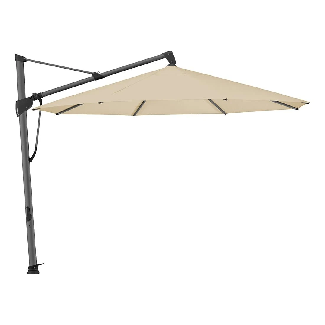 Bedienung: Sie öffnen und schliessen den SOMBRANO® S+ mit der abnehmbaren Handkurbel. Der Kurbelantrieb ist selbstarretierend. Mit der Lenkstange neigen Sie das Schirmdach auf beiden Seiten bis zu 54°. Der Freiarmschirm lässt sich dank kugelgelagertem Drehfuss um 360° drehen.