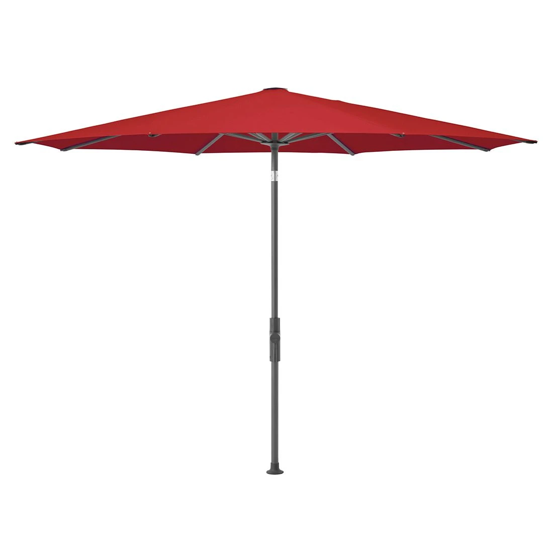 Das anthrazit pulverbeschichtete Aluminium des Gestells und der Streben sorgt mit dem flachen Schirmdach für die moderne, schwebende Optik. Der hochwertige Polyester-Schirmstoff in Carmine ist dank flexibler und mit Leder verstärkten Enden selbstspannend.