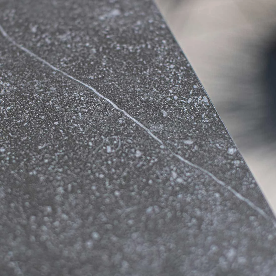 Die Tischplatte besteht aus Dekton. Dekton ist eine Mischung aus 20 natürlichen Mineralien. Bei der Herstellung von Dekton kommt eine besondere Technologie zum Einsatz, die in der Lage ist, mineralische Partikel so zu sintern, dass sie sich miteinander verbinden. Das Ergebnis: eine langlebige, sehr robuste und für jeden Einsatzbereich geeignete Tischplatte. Für ein stimmiges Gesamtbild erscheint die Platte in der Farbe Fossil Natur.