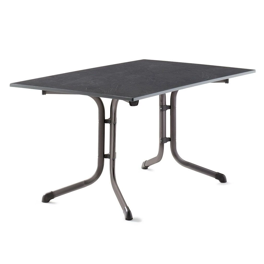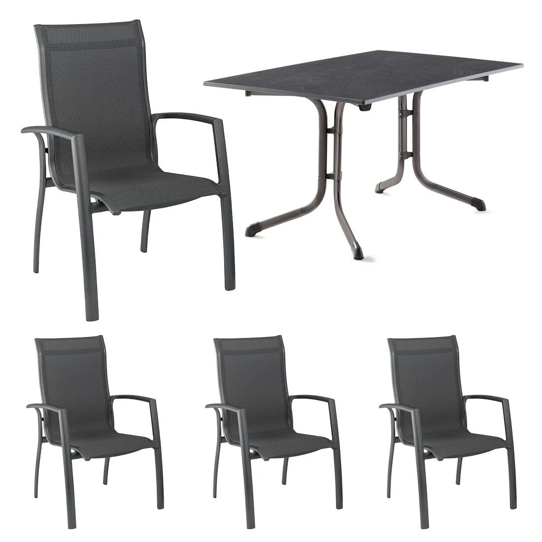 Damit das Gartenmöbel-Set optisch ansprechend ist, sind das Gestell und die Sitzfläche im Farbton Anthrazit gehalten. Das Gestell ist aus Aluminium gefertigt. Dadurch lassen sich die Möbel leicht von einem Standort zum nächsten transportieren und sind dennoch sehr stabil. Ein ist die Bespannung der Sitzflächen mit Textilene. Dieses Material zeichnet sich durch eine hohe Robustheit gegenüber Hitze und Frost aus und ist leicht zu reinigen. Das Set beinhaltet auch einen Tisch. Das Material, das für die Tischplatte verwendet wird, heißt „Vivodur“. Dabei handelt es sich um eine mit Melamin beschichtete Spanplatte. Durch die Beschichtung ist die Platte wetter- und kälteresistent sowie schlagfest und damit die perfekte Outdoor-Tischplatte. Farblich überzeugt die Tischplatte in Schiefer. Mit der rechteckigen Form lässt sich der Tisch platzsparend in Ecken oder an Häuserwänden aufstellen.