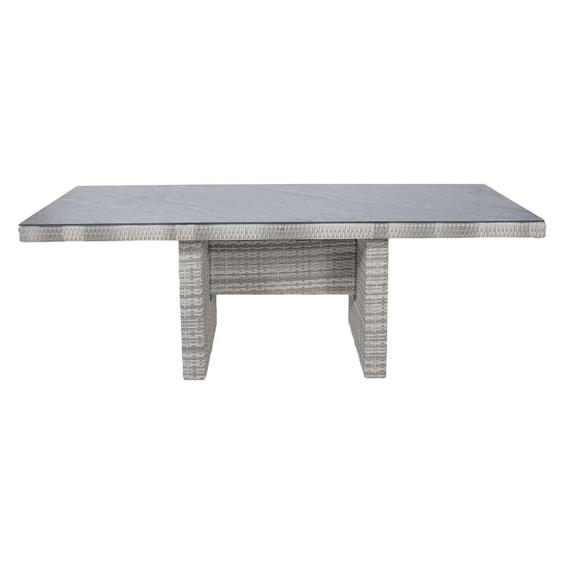 Aufgrund seines Gestells aus Aluminium zählt der Gartentisch Parma zu den modernen Tischmodellen, die sich im Garten und auf der Terrasse komfortabel aufstellen und bewegen lassen. Die Geradlinigkeit des Designs wird durch das Gestell in Wangenform betont. Die Tischplatte ist aus wertigem Keramik-Glas gefertigt. Im Gegensatz zu vielen anderen Tischplattenmaterialien sind solche Platten äußerst kälte- und hitzebeständig und zählen somit zu den robustesten Tischplatten auf dem Markt. Für ein elegantes Gesamtbild erscheint die Platte in der Farbe Stein Grau. Mit der rechteckigen Form lässt sich der Gartentisch platzsparend in Ecken oder an Häuserwänden aufstellen.