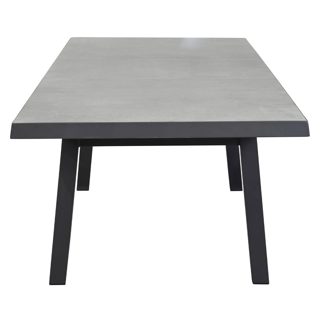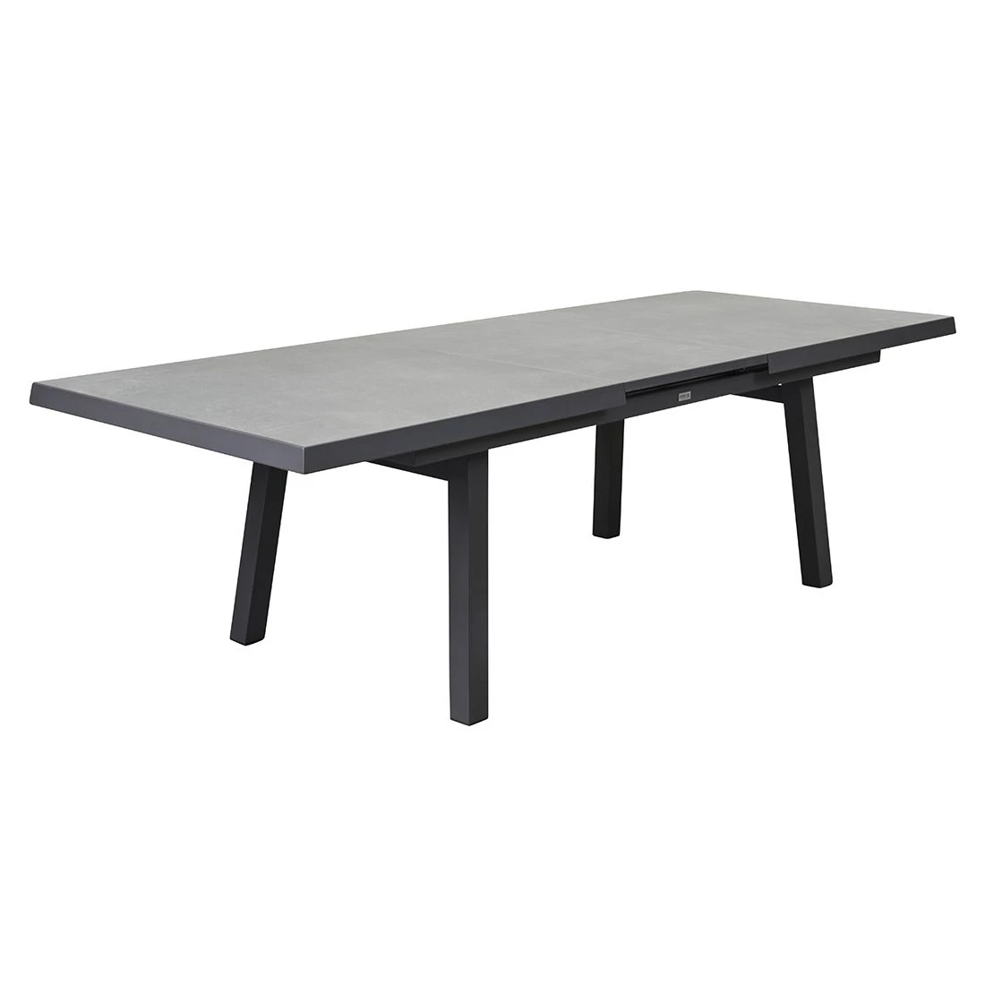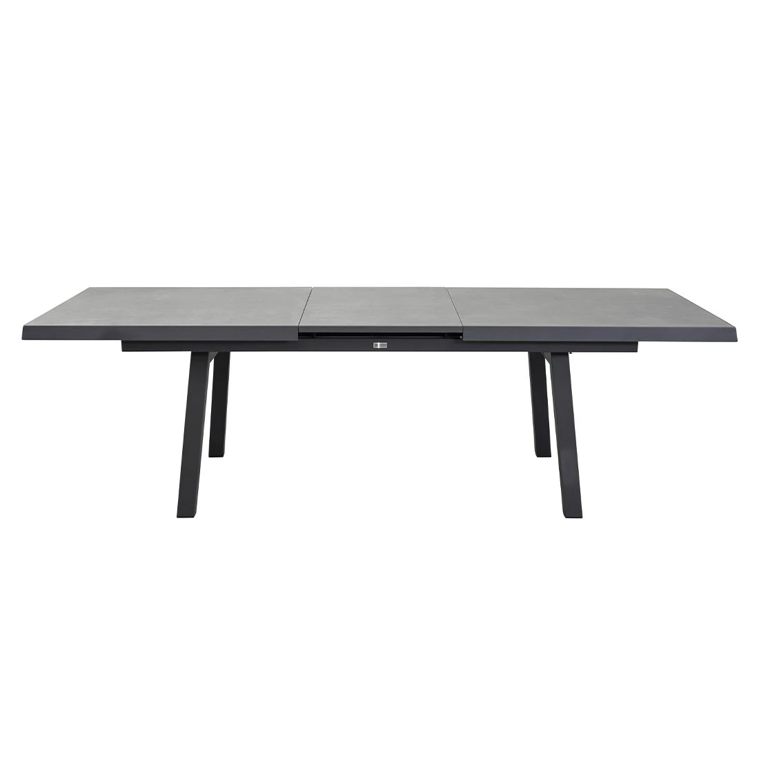 Als Gestellmaterial dient hochwertiges Aluminium. Das klassische Vierfuß-Gestell garantiert Ihnen maximale Beinfreiheit. Keramik ist das Material, das für die Tischplatte gewählt wird. Das robuste Material ist nicht so schwergewichtig wie Naturstein, sorgt allerdings ebenso für windsicheren Halt im heimischen Garten. Für ein stimmiges Gesamtbild erscheint die Platte in der Farbe Beton Optik. Die rechteckige Form ermöglicht es Ihnen, den Ausziehtisch in Ecken und an Häuserwänden platzsparend einzusetzen.