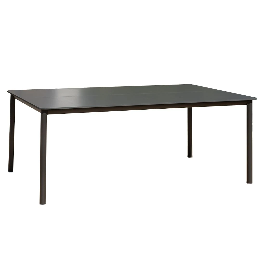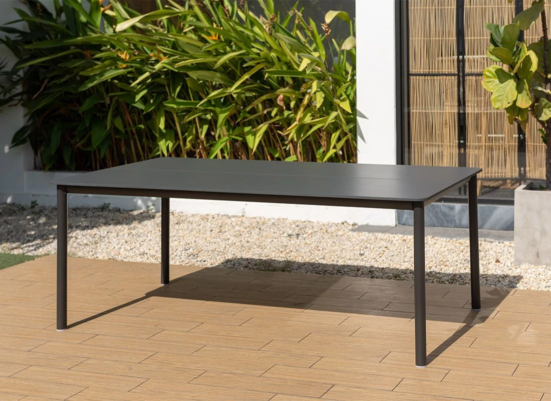 Mit seinem Gestell-Material Aluminium zählt der Gartentisch Horizon zu den modernen Tischmodellen, die sich im Garten und auf der Terrasse ganz einfach aufstellen und bewegen lassen. Das klassische Vierfuß-Gestell garantiert Ihnen maximale Beinfreiheit. Die Tischplatte ist aus Schichtstoffplatte gefertigt und dadurch für den Einsatz auf der Terrasse, im Garten und auf dem Balkon geeignet. Für ein stimmiges Gesamtbild erscheint die Platte in der Farbe Dunkelgrau. Die rechteckige Form ermöglicht es Ihnen, den Gartentisch in Ecken und an Häuserwänden platzsparend einzusetzen.