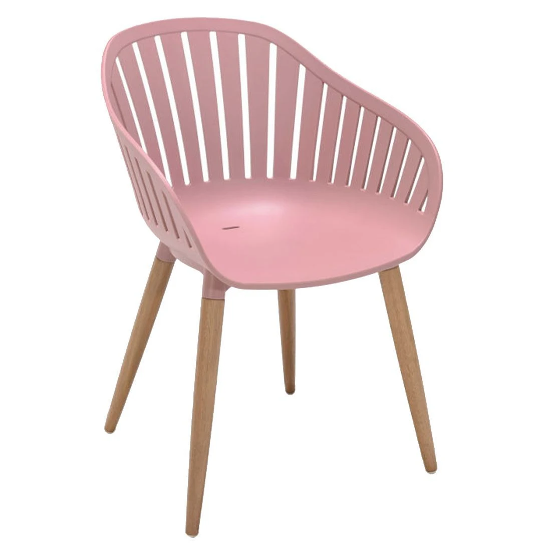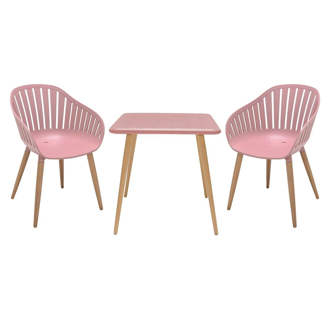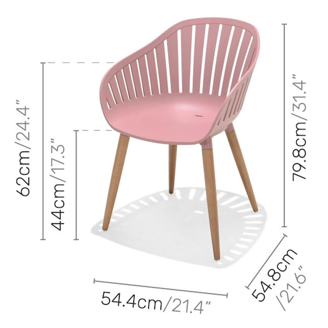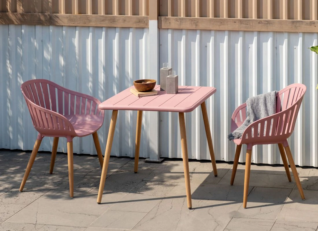 Die Gestelle sind aus dem Naturmaterial Eukalyptus gefertigt (Farbe: Braun) und somit äußert witterungsbeständig. Ein weiterer Pluspunkt der Sitzmöbel sind die Kunststoff-Sitzflächen in Pfingstrose. Kunststoff ist sehr pflegeleicht und verleiht dem Sitzmöbel ein klassisches Aussehen.