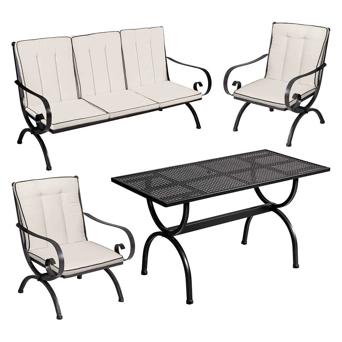 Der Korpus und die Sitzfläche bestehen aus Schmiedeeisen. Zum besonderen Blickfang wird Gartenmöbel-Set dank des hochwertigen Schmiedeeisens. Dieses verleiht Gartenmöbel-Set ein verträumtes Erscheinungsbild. Optisch begeistert das Gestell in der Farbe Marone. Die Farbe des Bezugs ist Natur. Die Tischplatte ist aus Streckmetall gefertigt und dadurch für den Einsatz auf der Terrasse, im Garten und auf dem Balkon geeignet.