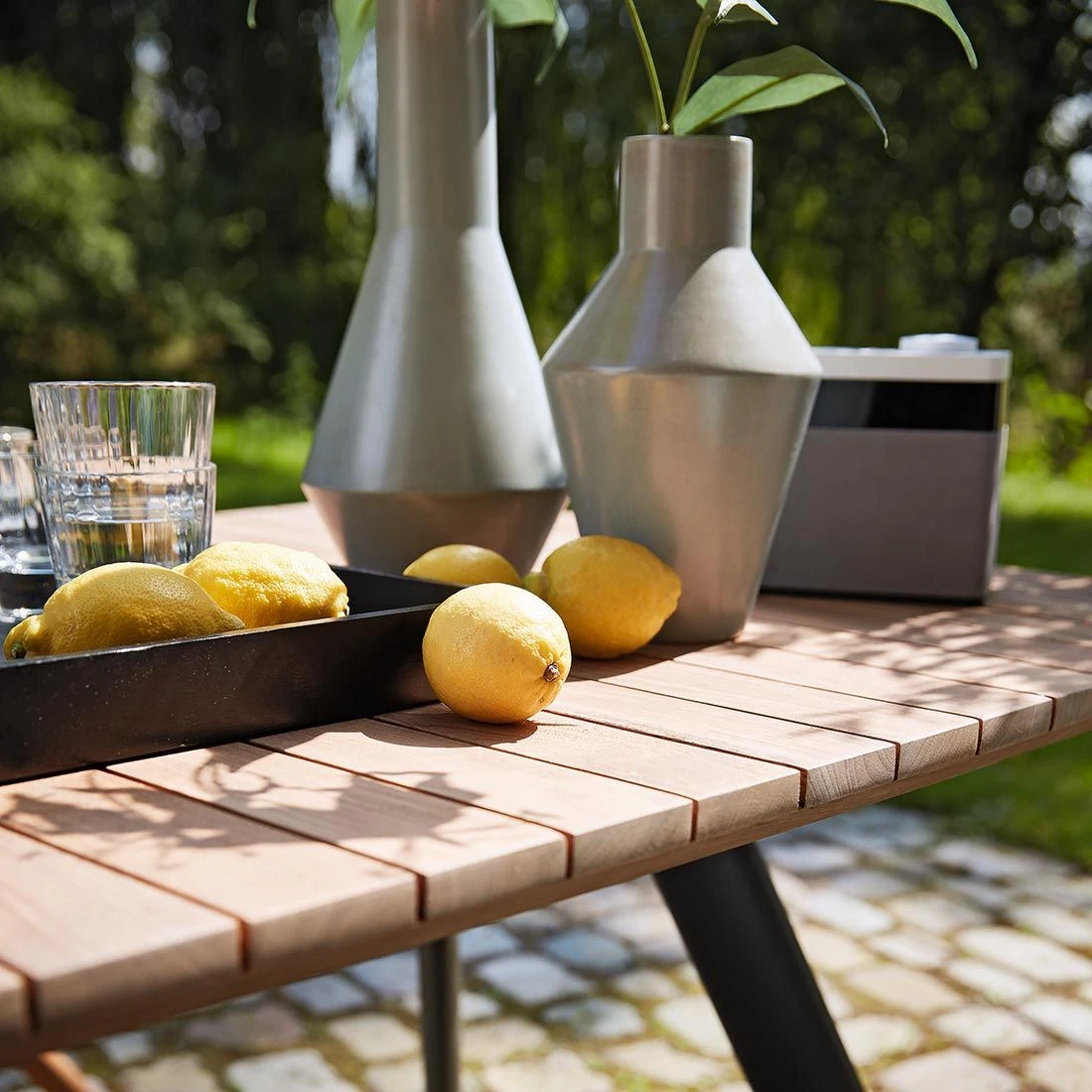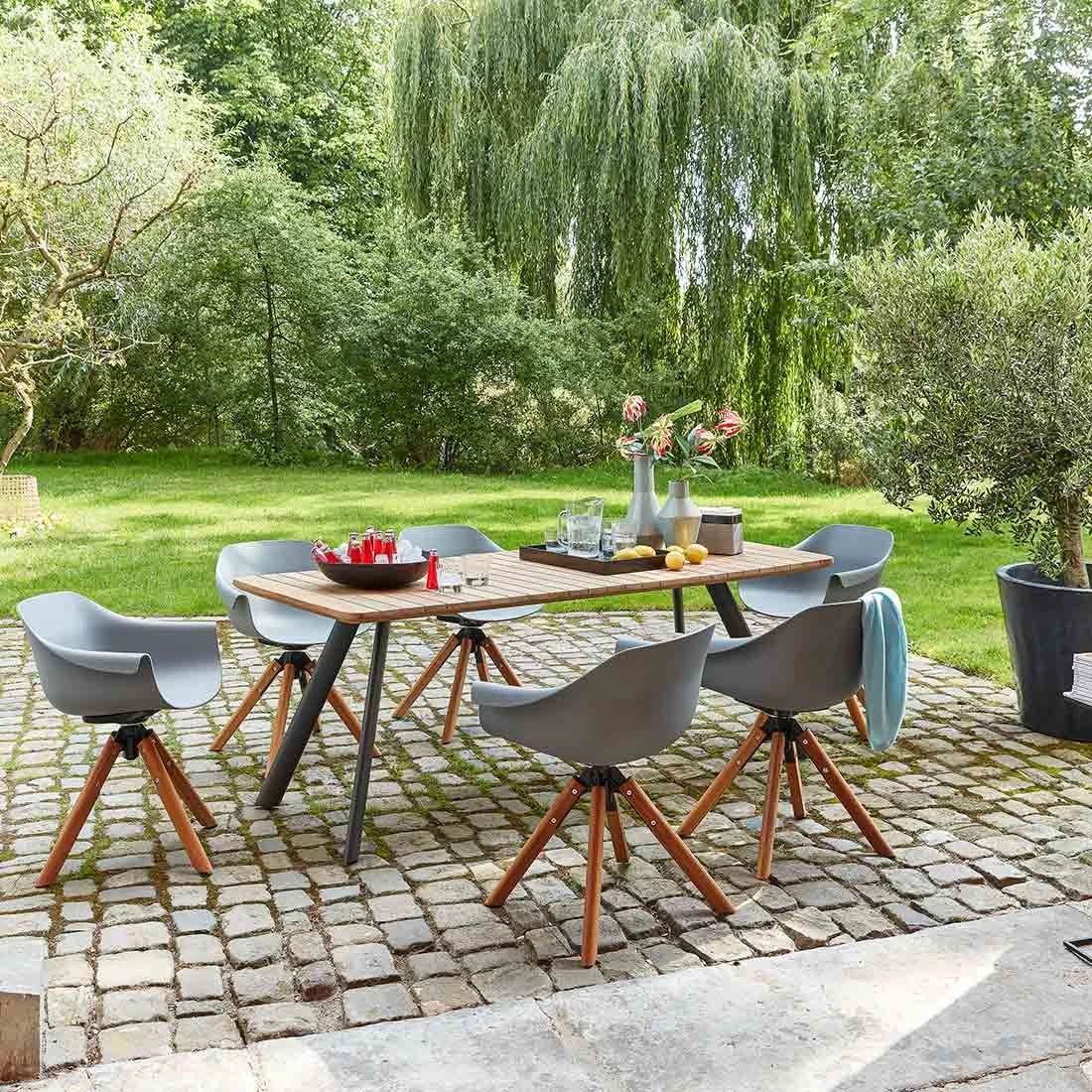 Positiv hervorzuheben sind zudem die Sitzflächen aus Kunststoff in der Farbe Grau. Dieses Material findet sich bei vielen klassischen Sitzmöbeln, weil es sehr einfach zu reinigen und leicht ist. Ton in Ton ist das Gartenmöbel-Set gehalten: Sowohl die Gestelle als auch die Tischplatte sind aus Teakholz gefertigt.