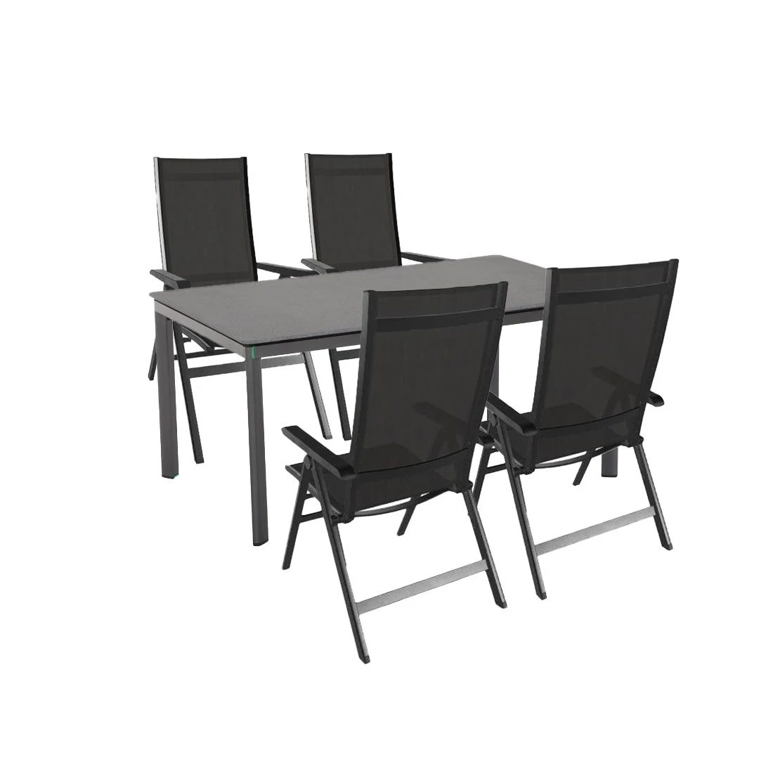 Damit das Gartenmöbel-Set optisch ansprechend ist, sind die Sitzfläche und der Bezug im Farbton Anthrazit gehalten. Das Gestell ist aus Aluminium gefertigt. Dadurch lassen sich die Möbel leicht von einem Standort zum nächsten transportieren und sind dennoch sehr stabil. Ein weiterer Pluspunkt ist die Bespannung der Sitzflächen mit Textilene. Dieses Material zeichnet sich durch eine hohe Robustheit gegenüber Hitze und Frost aus und ist leicht zu reinigen. Zum Set gehört auch ein passender Tisch. Dessen Tischplatte ist aus Creatop Basic gefertigt und rundet das stimmige Gesamtbild des Gartenmöbel-Sets ab. Farblich überzeugt die Tischplatte in Granit. Die Form des Tisches ist klassisch rechteckig gestaltet.