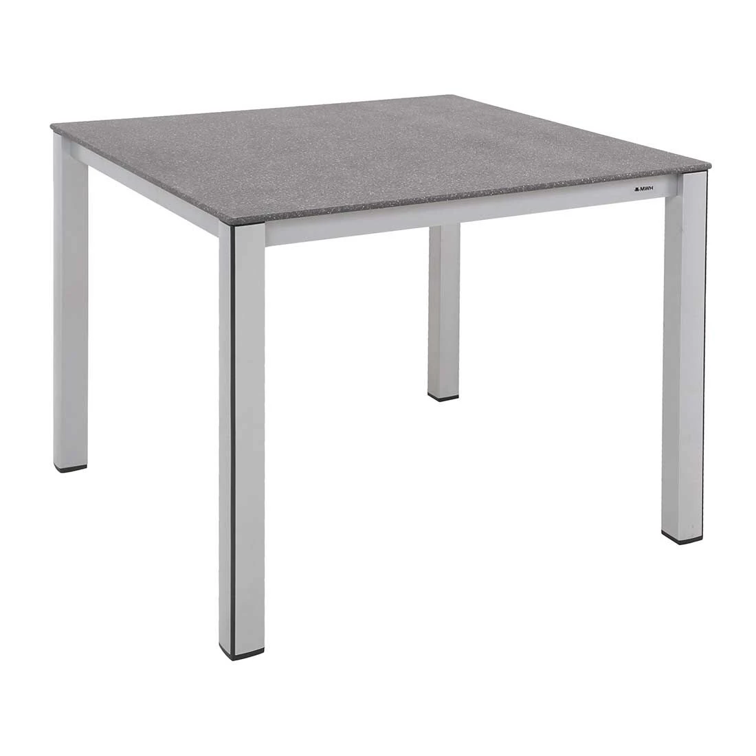 Das Gestell des eleganten Tisches ist aus Aluminium gefertigt. Farblich ist das Gestell in Silber gehalten. Farblich ist die Tischplatte in einem schönen Granit gehalten. Der Gartentisch ist klassisch quadratisch gehalten.