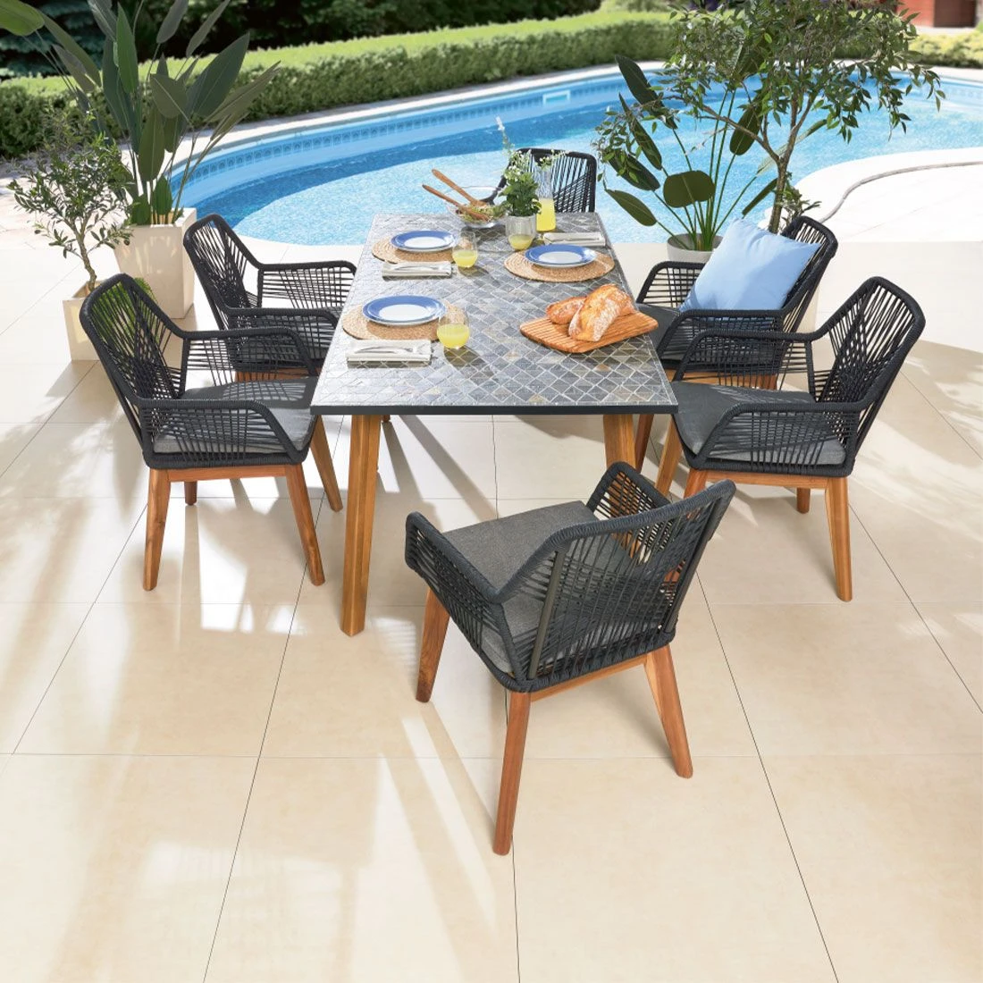 Die hohe Dichte und gute Wetterfestigkeit machen das Gestell, das aus Akazienholz gefertigt wird, besonders robust und wetterfest. Das klassische Vierfuß-Gestell garantiert Ihnen maximale Beinfreiheit. Beim Tischplatten-Material handelt es sich um Mosaik, weshalb Sie den Gartentisch optimal im Garten oder auf der Terrasse verwenden können. Für ein elegantes Gesamtbild erscheint die Platte in der Farbe Mosaik Hell. Die Form des Gartentisches ist klassisch rechteckig gestaltet.