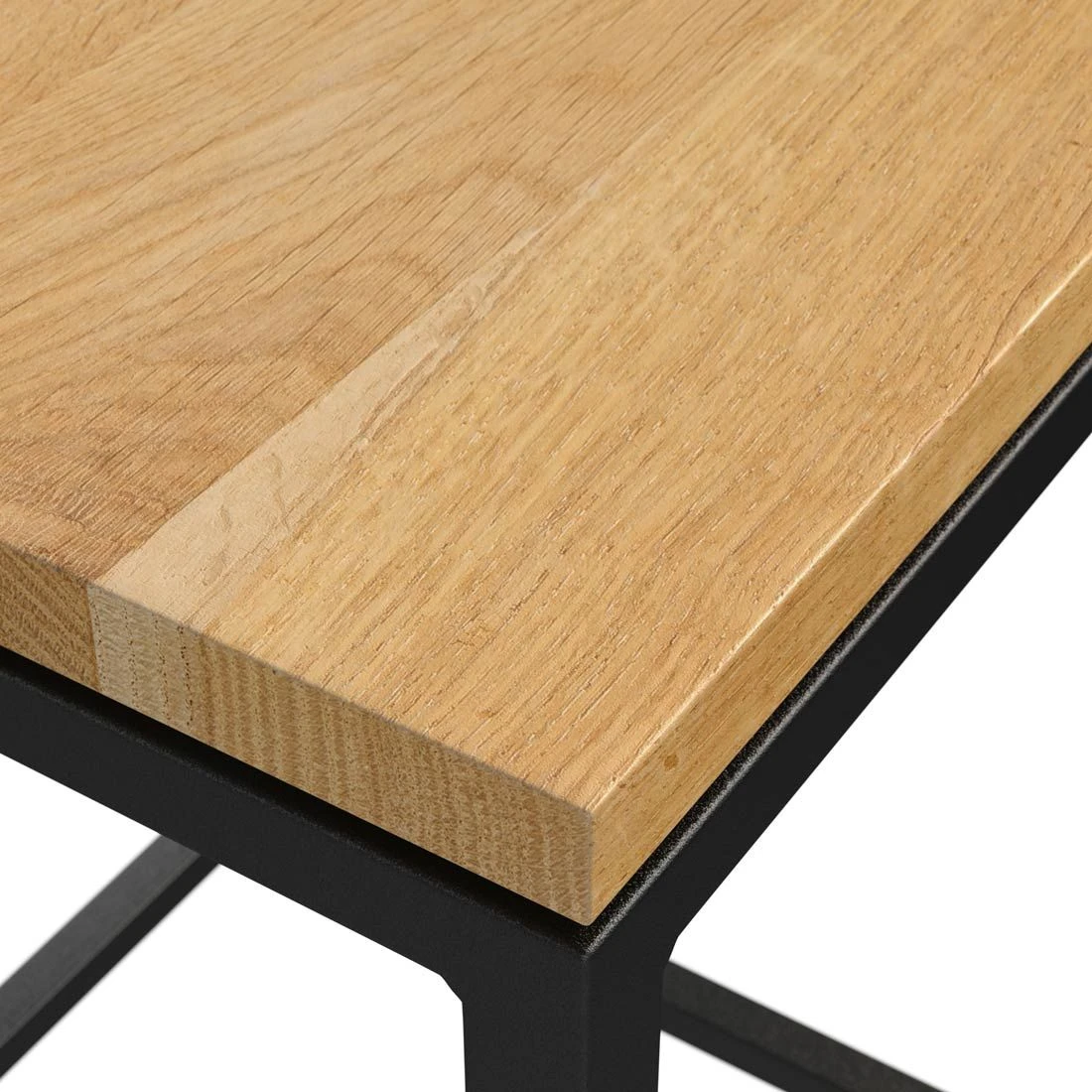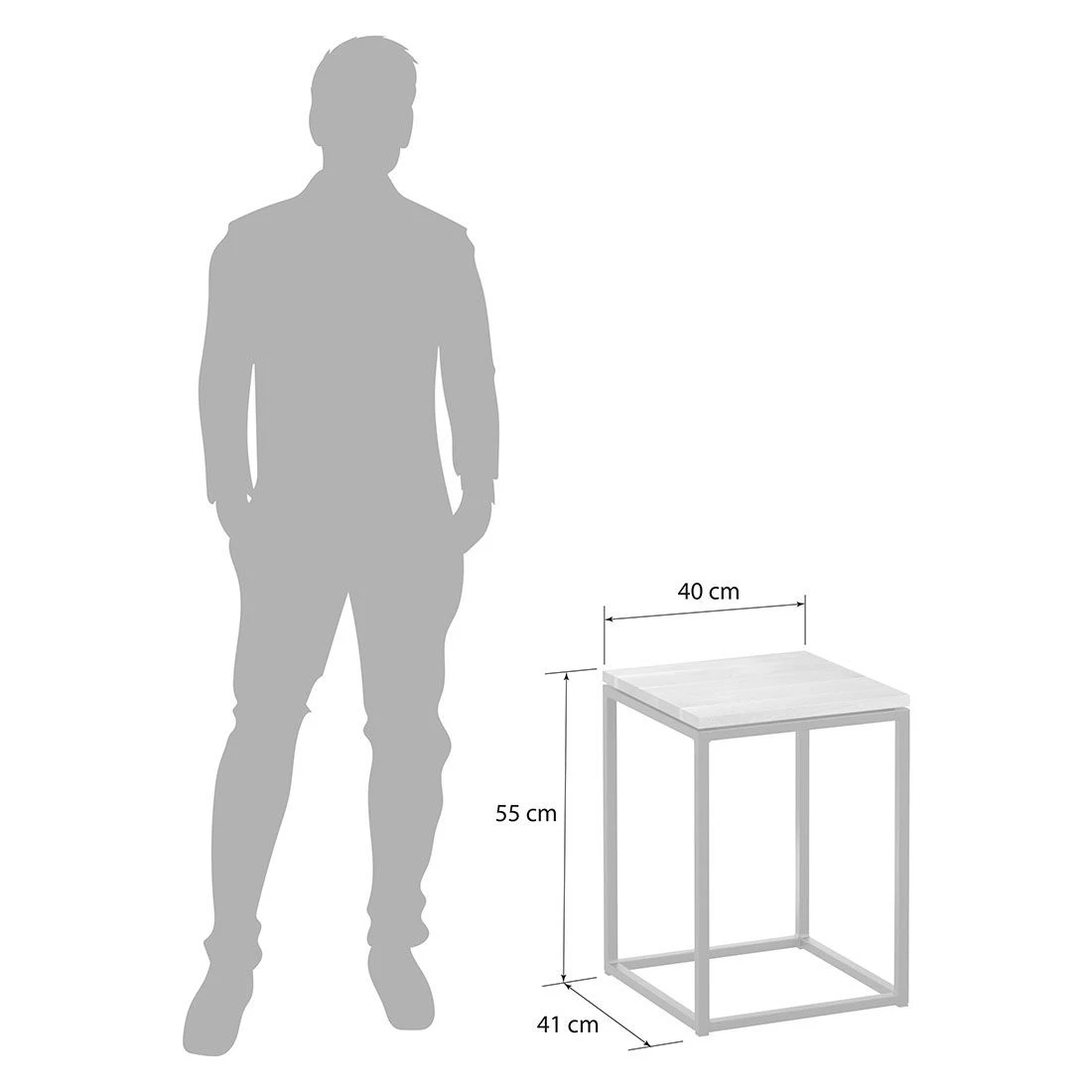Das robuste Gestell-Material des Beistelltischs besteht aus Stahl. Die Tischplatte ist aus Wildeiche gefertigt und dadurch für den Einsatz auf der Terrasse, im Garten und auf dem Balkon geeignet. Für ein stimmiges Gesamtbild erscheint die Platte in der Farbe Natur. Die Form des Beistelltischs ist kompakt gehalten.