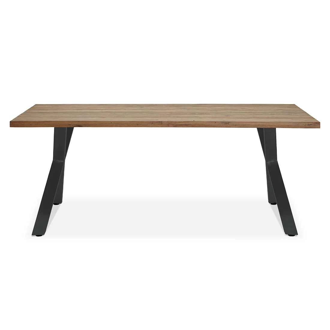 Das Gestell besteht aus pflegeleichtem und rostfreiem Edelstahl. Dass ein Möbelstück auch ein Hingucker sein kann, beweist dieses Modell mit seinem außergewöhnlichen Gestell in X-Form. Die Gebrauchsspuren in der Tischplatte sind Teil der Formensprache. Denn die Tischplatte ist aus wiederverwertetem Teak hergestellt worden, das zuvor aus alten Hütten und Booten gewonnen wurden. Bei der Aufarbeitung werden dann Einkerbungen, Nagel- und Schraublöcher bewusst erhalten. Jede Tischplatte und damit jeder Gartentisch ist also ein echtes Unikat. Farblich ist die Platte in Natur gehalten. Mit der rechteckigen Form lässt sich der Gartentisch platzsparend in Ecken oder an Häuserwänden aufstellen.