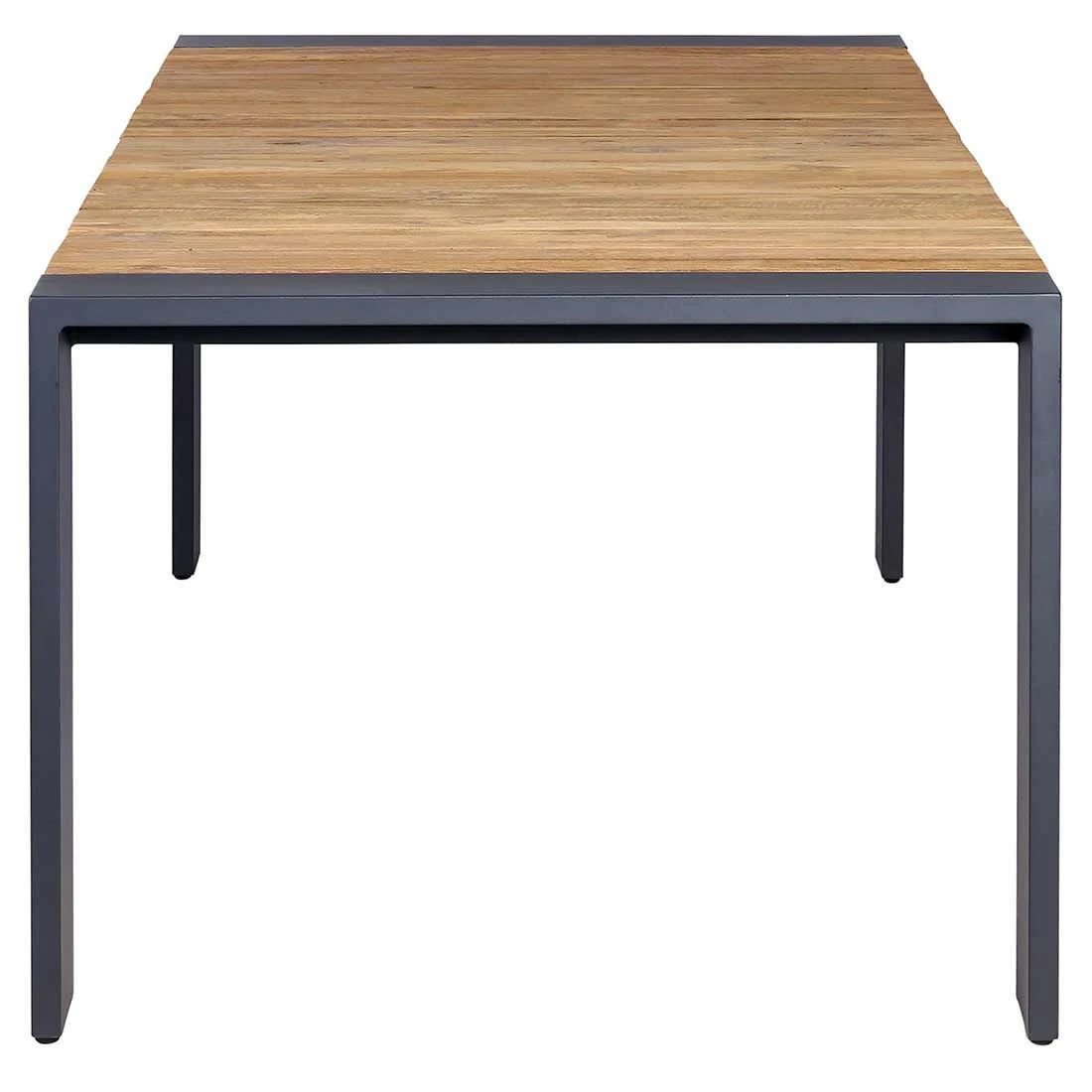 Zum Lieferumfang des Sets gehört auch ein praktischer Tisch. Die Gebrauchsspuren in der Tischplatte sind Teil des Designs der Tischplatte. Denn diese ist aus wiederverwertetem Teak gearbeitet, das zuvor aus alten Hütten und Booten gewonnen wurde. Bei der Aufarbeitung werden dann Einkerbungen, Nagellöcher und Co. bewusst erhalten. Jede Tischplatte und damit jeder Gartentisch ist also ein Unikat. Klassisch aus vier Tischbeinen besteht das Gestell des Tisches. Die Form des Tisches ist klassisch rechteckig gestaltet.