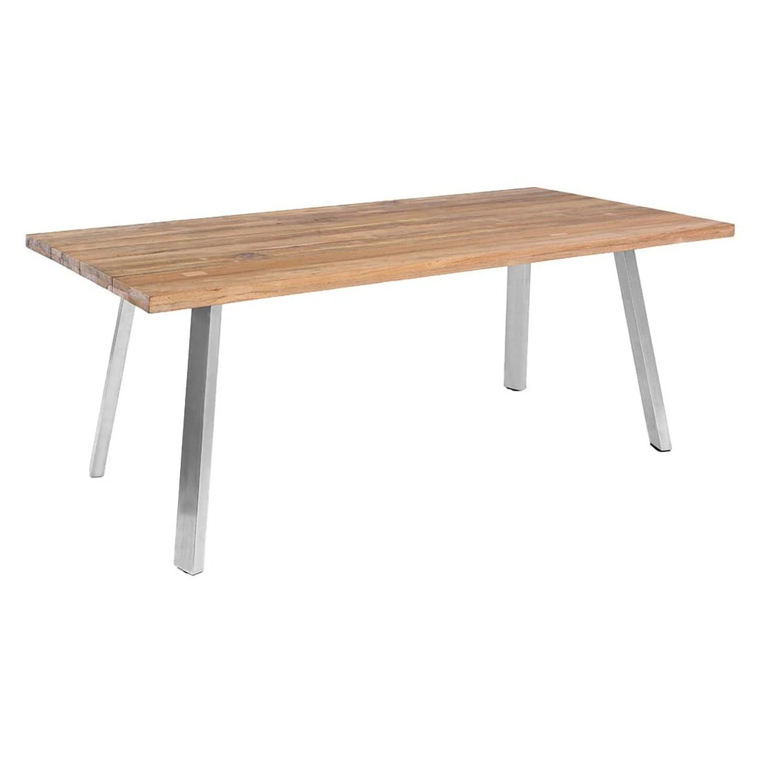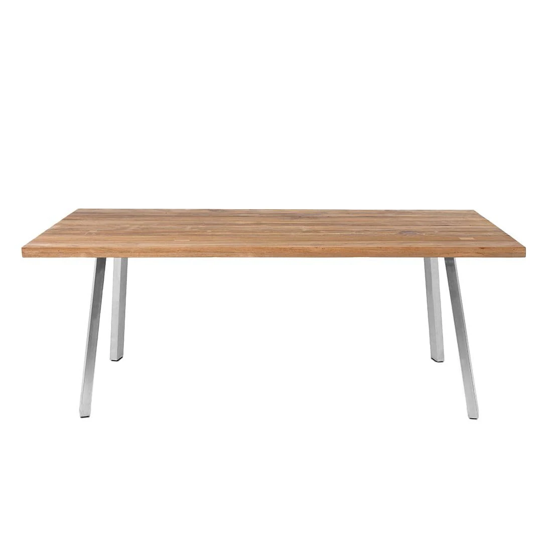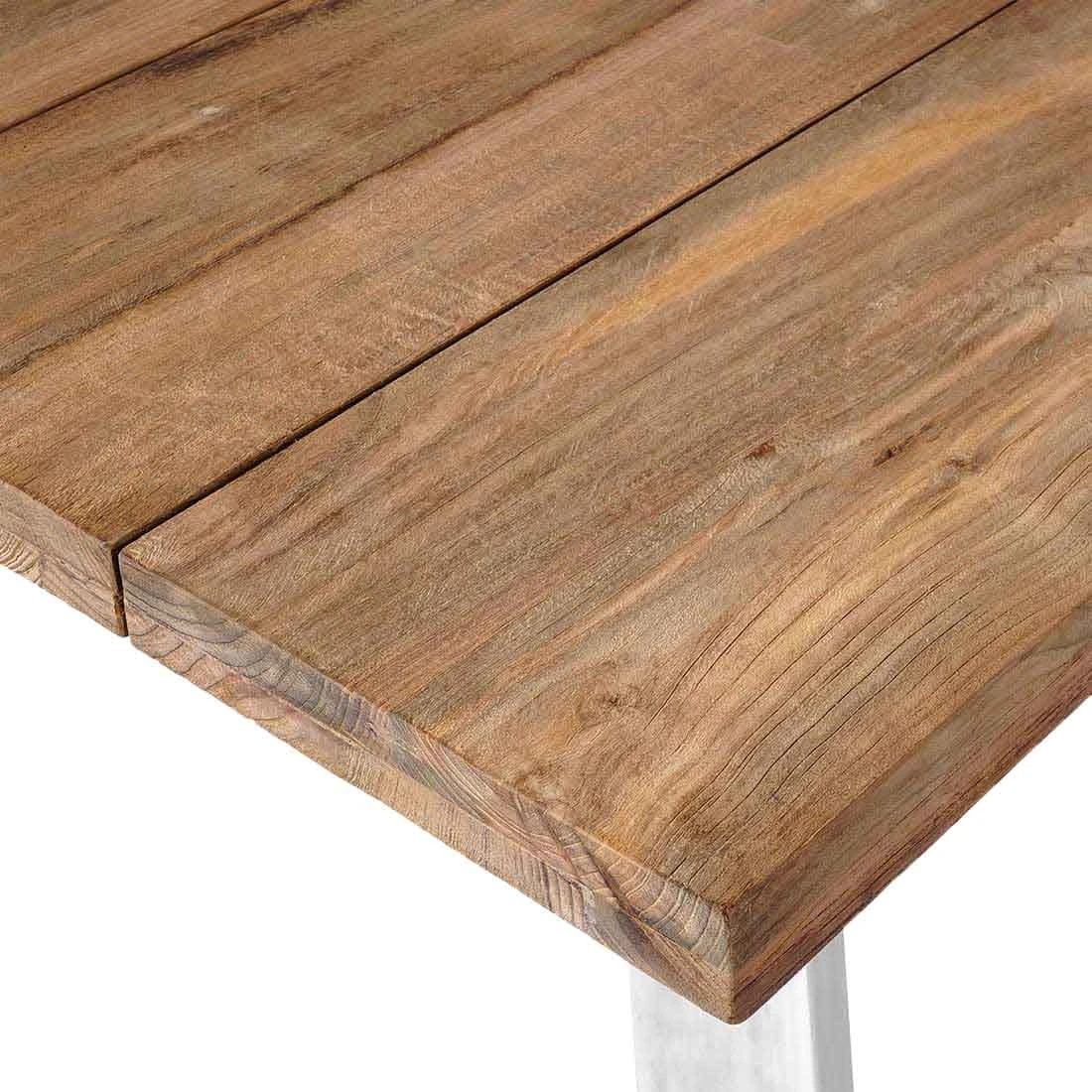 Zum Lieferumfang des Sets gehört auch ein passender Tisch. Als Material für die Tischplatte wird das hochwertige Hartholz Teak gewählt. Die Maserung dieses Holzes und der warme Farbton integrieren sich sehr angemessen in die Umgebung eines jeden Gartens und verströmen eine besonders natürliche Atmosphäre. Klassisch aus vier Tischbeinen besteht das Gestell des Tisches. Mit der rechteckigen Form lässt sich der Tisch platzsparend in Ecken oder an Häuserwänden aufstellen.
