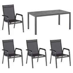 Die Gestelle sind aus Edelstahl gefertigt und sorgen somit für einen modernen Look und eine hohe Stabilität. Optisch ansprechend ist die Farbgebung der Gestelle in Silber. Ein weiteres Highlight der Sitzmöbel ist die Bespannung der Sitzflächen mit Textilene in der Farbe Silber-Schwarz. Dieses Material zeichnet sich durch eine hohe Robustheit gegenüber Hitze und Frost aus und ist leicht zu reinigen. Die Sitzflächen und die Bezüge sind einheitlich im Farbton Silber-Schwarz gehalten. Zum Lieferumfang des Sets gehört auch ein praktischer Tisch. Die Gebrauchsspuren in der Tischplatte sind Teil des Designs der Tischplatte. Denn diese ist aus wiederverwertetem Teak gearbeitet, das zuvor aus alten Hütten und Booten gewonnen wurde. Bei der Aufarbeitung werden dann Einkerbungen, Nagellöcher und Co. bewusst erhalten. Jede Tischplatte und damit jeder Gartentisch ist also ein Unikat. Mit der rechteckigen Form lässt sich der Tisch platzsparend in Ecken oder an Häuserwänden aufstellen. Während die Farbe des Gestells Silber ist, begeistert die Tischplatte in Teak Recycelt.