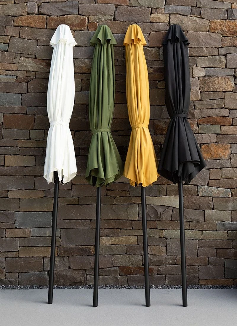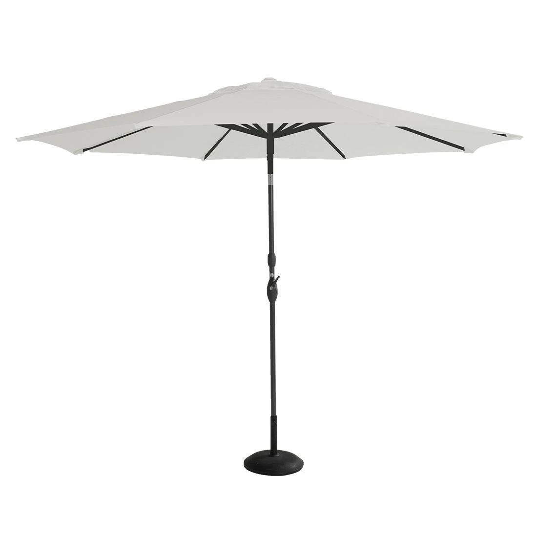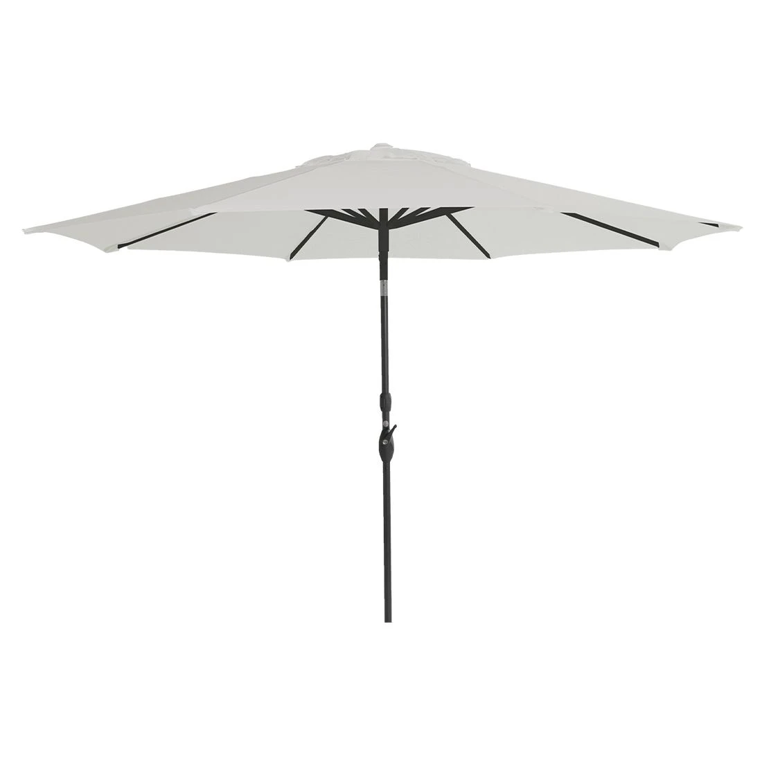 Das moderne Schirmmodell besteht aus einem Aluminiumgestell in Schwarz mit 6 Aluminiumschienen und einem weißen Bezug aus 100% Polyester. Der Sonnenschirm ist mit einer praktischen Kippfunktion ausgestattet und zusätzlich als Pluspunkt ist eine Schutzhülle inklusive.