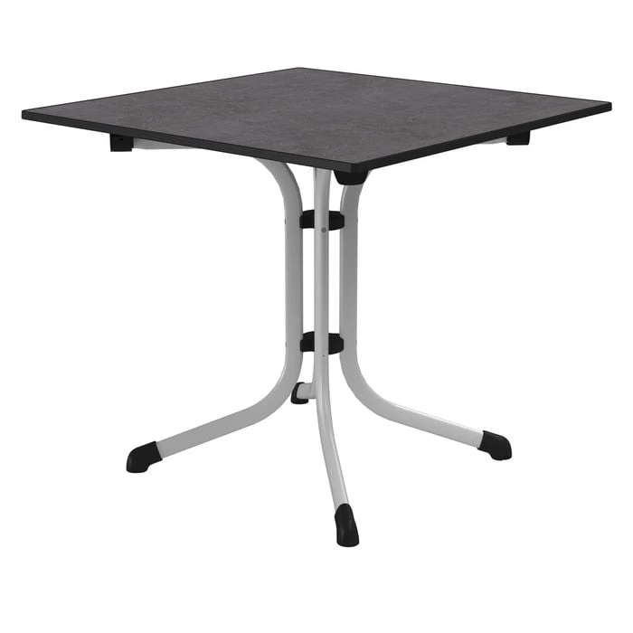 Für das Gestell wird robuster Stahl verarbeitet. Ein stabiler Unterbau und dabei gleichzeitig dekorativ ist das Säulengestell. Für die Tischplatte wird das hochwertige Material „Vivodur“ aus dem Hause Sieger verwendet. Die Beschichtung aus Melamin macht die Platte wetter-, kälte-, und schlagfest und somit zum perfekten Begleiter für Draußen. Farblich ist die Tischplatte in einem schönen Schiefer Anthrazit gehalten. Mit der kompakten quadratischen Form sorgt der Klapptisch auch auf beschränktem Raum für Gemütlichkeit.
