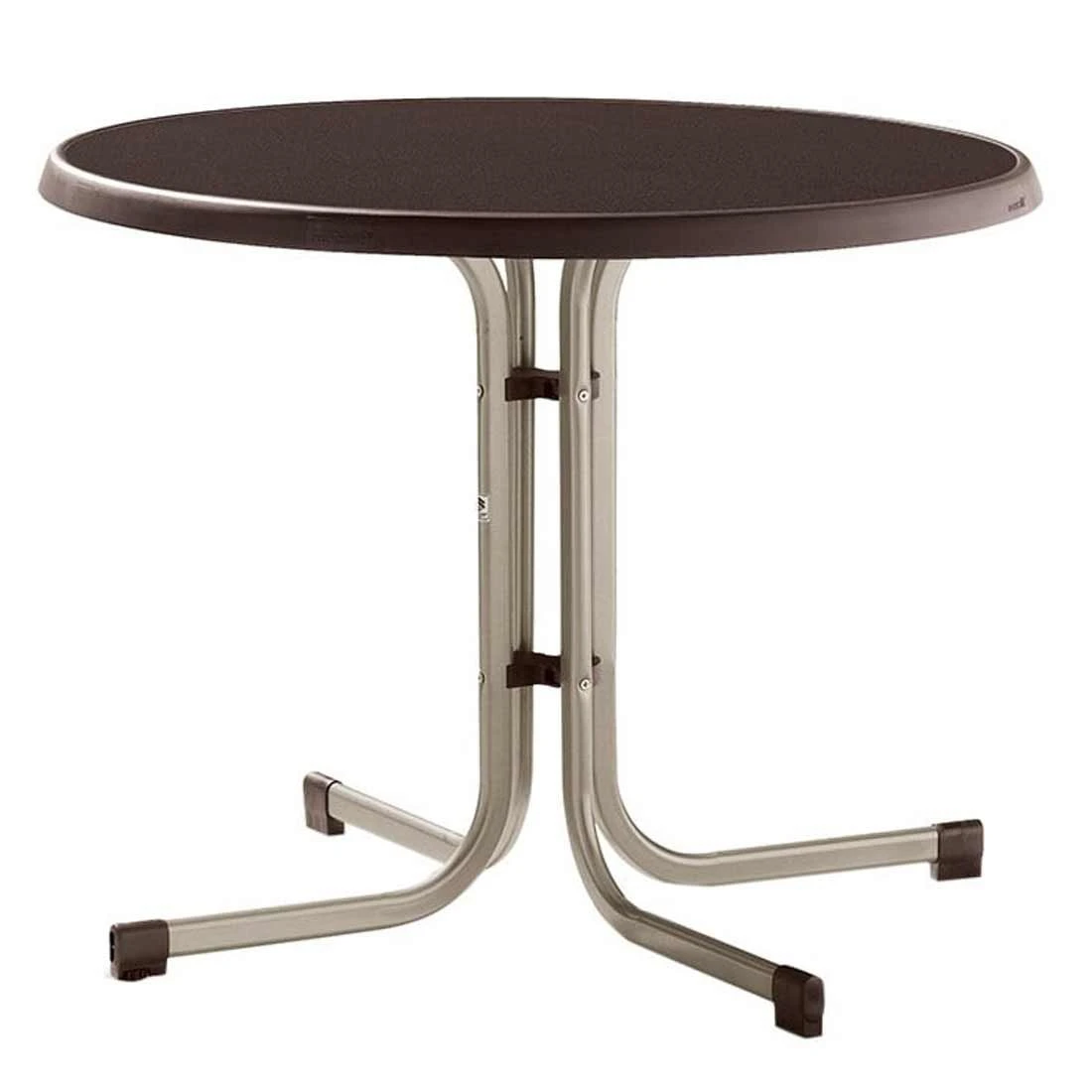 Das robuste Gestell-Material des Klapptisches besteht aus Stahl. Farblich ist das Gestell in Champagner gehalten. Das Material, das für die Tischplatte verwendet wird, heißt „Mecalit“. Dabei handelt es sich um eine mit Melamin beschichtete Spanplatte. Durch die Beschichtung ist die Platte wetter- und kälte- sowie schlagfest und damit die perfekte Outdoor-Tischplatte. Farblich ist die Platte in Mocca gehalten. Den finalen Schliff erhält das Gestell durch seine attraktive Säulenform. Diese ist nicht nur ein absoluter Blickfang, sondern ermöglicht auch rundherum viel Beinfreiheit. Das Design des Klapptisches ist klassisch rund.