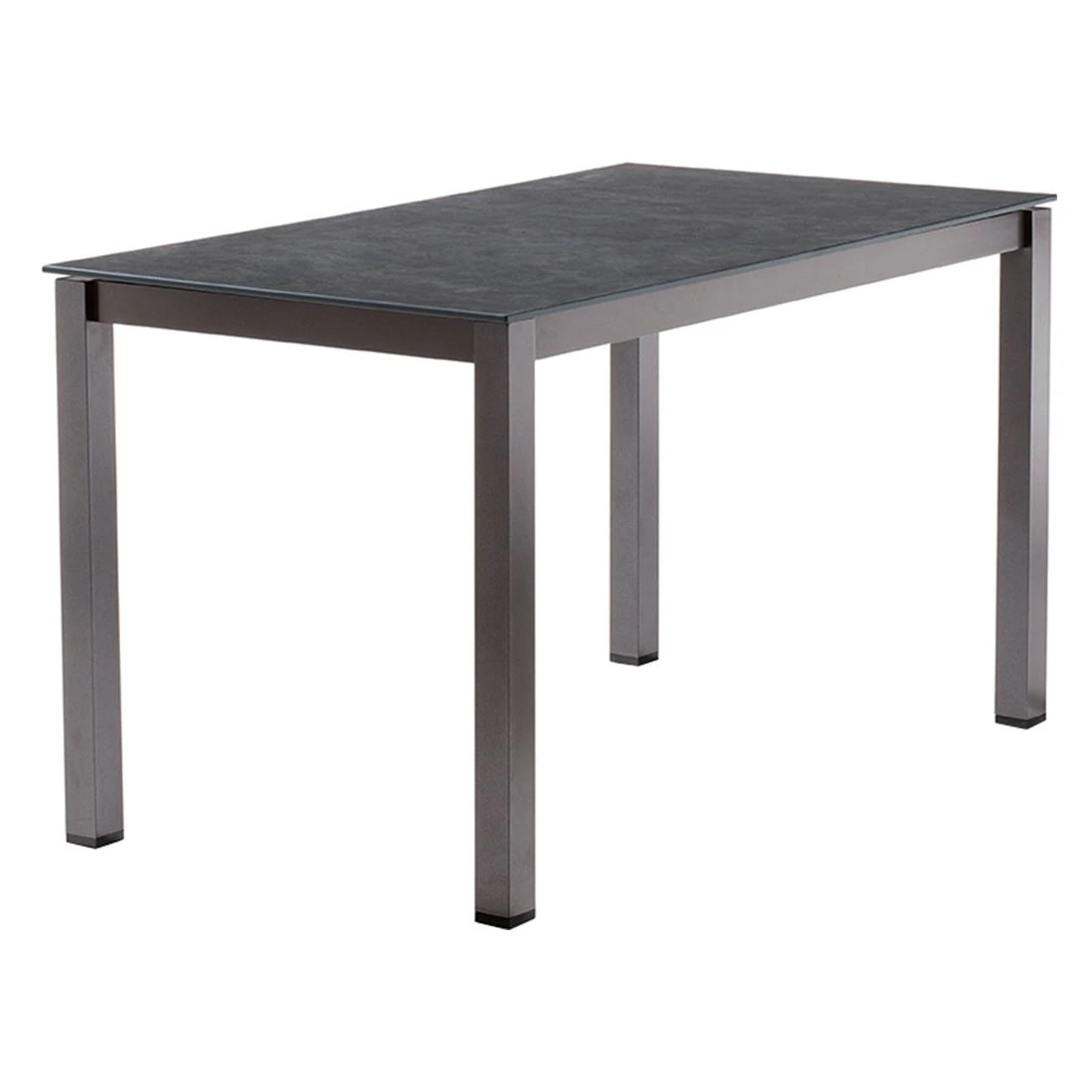 Aufgrund seines Gestells aus Aluminium zählt der Gartentisch zu den modernen Tischmodellen, die sich im Garten problemlos aufstellen und bewegen lassen. Farblich ist das Gestell in Eisengrau gehalten. Die Polytec-Tischplatte ist nicht nur ein optischer Hingucker, sondern besitzt auch beste Materialeigenschaften für Draußen. Die Platte ist wetter-, kälte- und kratzfest und damit der perfekte Begleiter für Ihren Outdoor-Bereich. Farblich ist die Tischplatte in einem schönen Schiefer gehalten. Der Gartentisch ist klassisch rechteckig gestaltet.