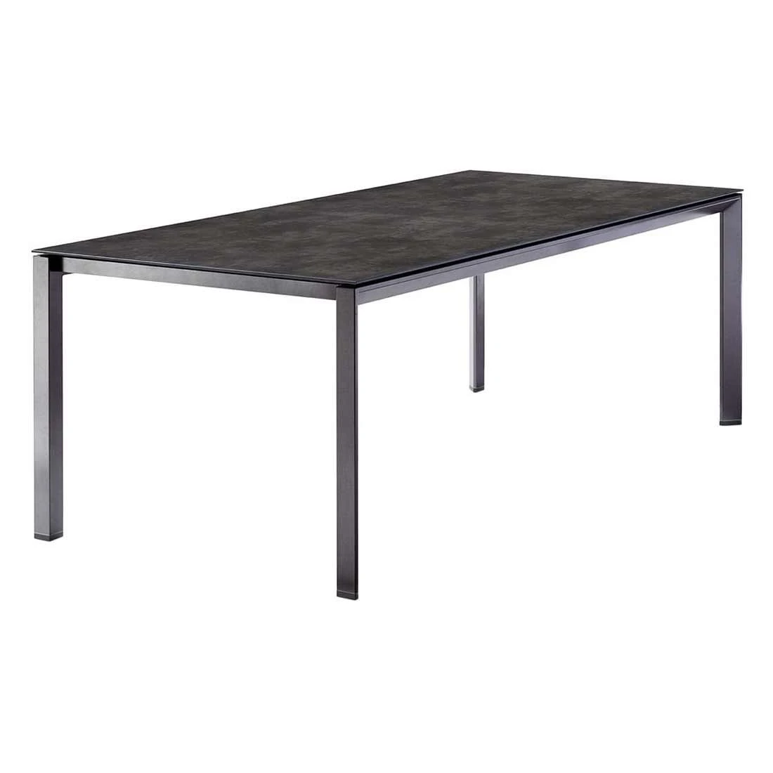 Als Material des Gestells dient hochwertiges und leichtes Aluminium. Klassisch aus vier Tischbeinen besteht das Gestell des Tisches. Die Polytec-Tischplatte ist nicht nur ein optischer Hingucker, sondern besitzt auch beste Materialeigenschaften für Draußen. Die Platte ist wetter-, kälte- und kratzfest und damit der perfekte Begleiter für Ihren Outdoor-Bereich. Farblich ist die Tischplatte in einem schönen Beton Dunkel gehalten. Die rechteckige Form ermöglicht es Ihnen, den Gartentisch in Ecken und an Häuserwänden platzsparend einzusetzen.