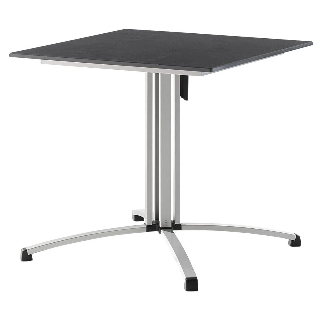 Als stabiler Unterbau für die Tischplatte dient ein Gestell aus hochwertigem Stahl. Das Tischgestell in Säulenform ist nicht nur ein wahrer Eyecatcher, sondern auch ein Garant für ausreichend große Beinfreiheit. Für die Tischplatte wird das hochwertige Material „Vivodur“ aus dem Hause Sieger verwendet. Die Beschichtung aus Melamin macht die Platte wetter-, kälte-, und schlagfest und somit zum perfekten Begleiter für Draußen. Für ein elegantes Gesamtbild erscheint die Platte in der Farbe Schiefer Anthrazit. Mit der kompakten quadratischen Form sorgt der Klapptisch auch auf kleinem Raum für Gemütlichkeit.