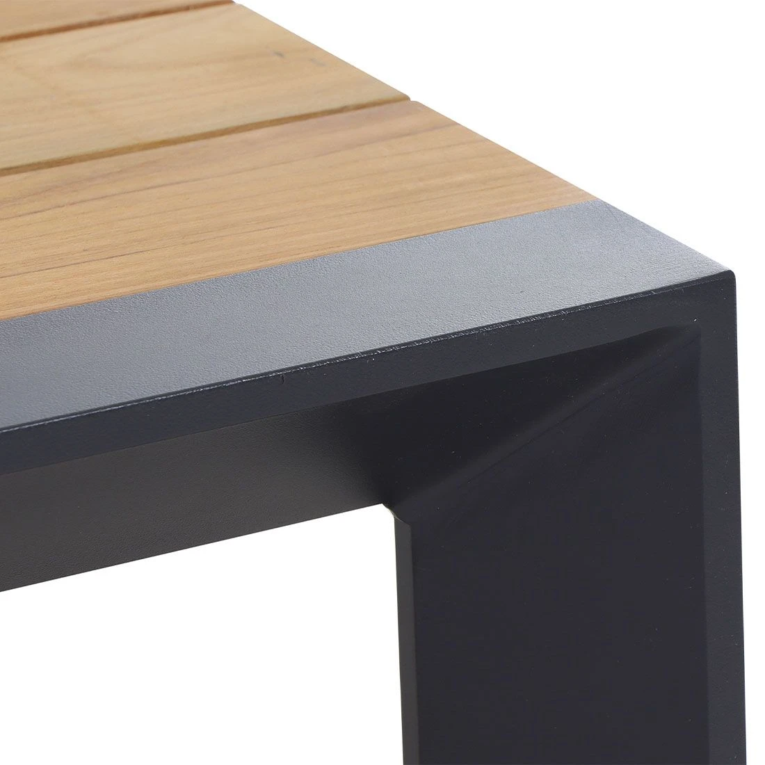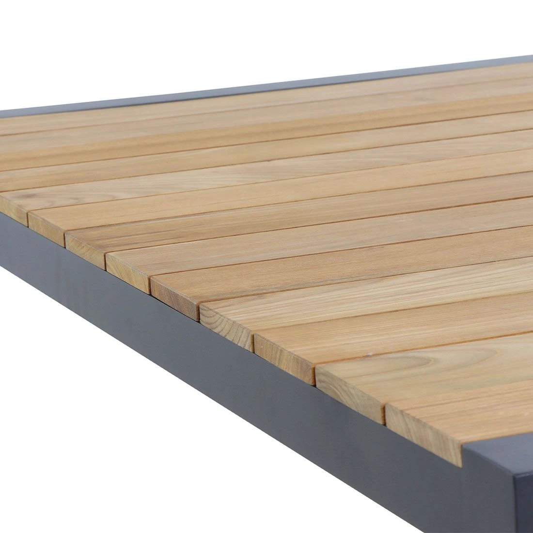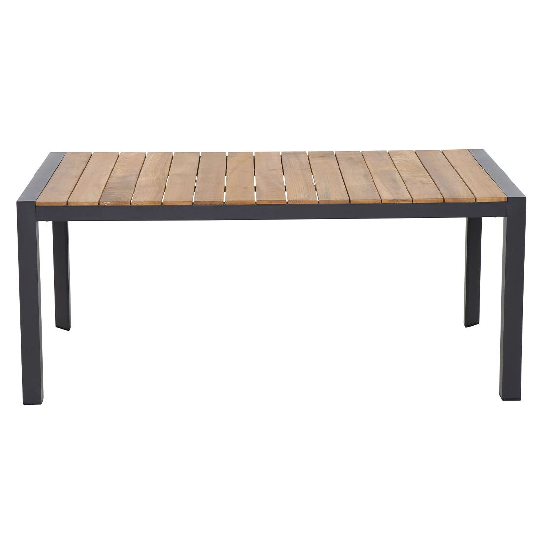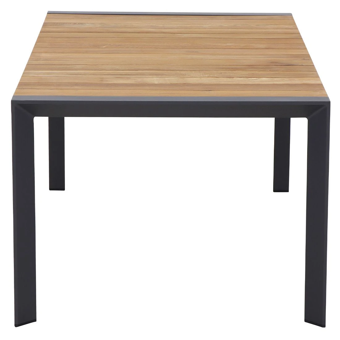 Klassisch aus vier Tischbeinen besteht das Gestell des Tisches. Die Platte des Tisches ist aus edlem Teakholz gefertigt. Mit ihrem hohen natürlichen Anteil an Öl ist sie bereits von Haus aus sehr gut vor Witterungseinflüssen geschützt. Farblich ist die Platte in Natur gehalten. Mit der rechteckigen Form lässt sich der Gartentisch platzsparend in Ecken oder an Häuserwänden aufstellen.
