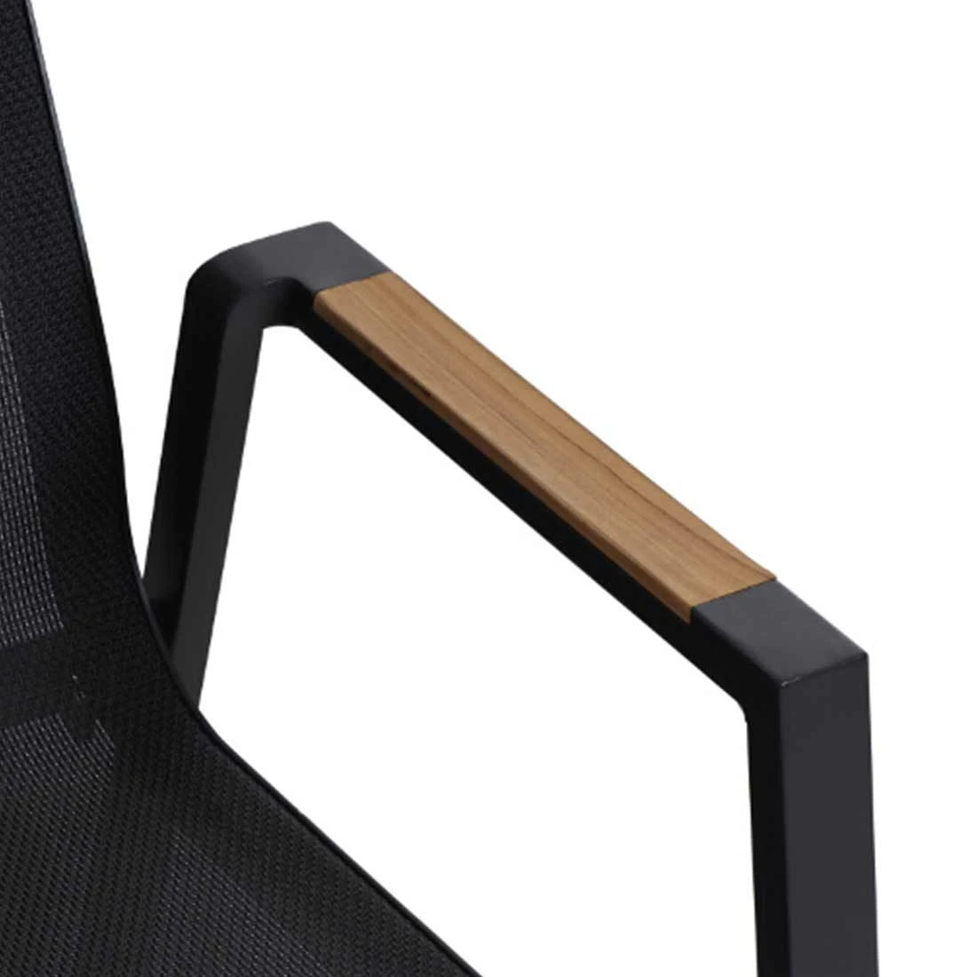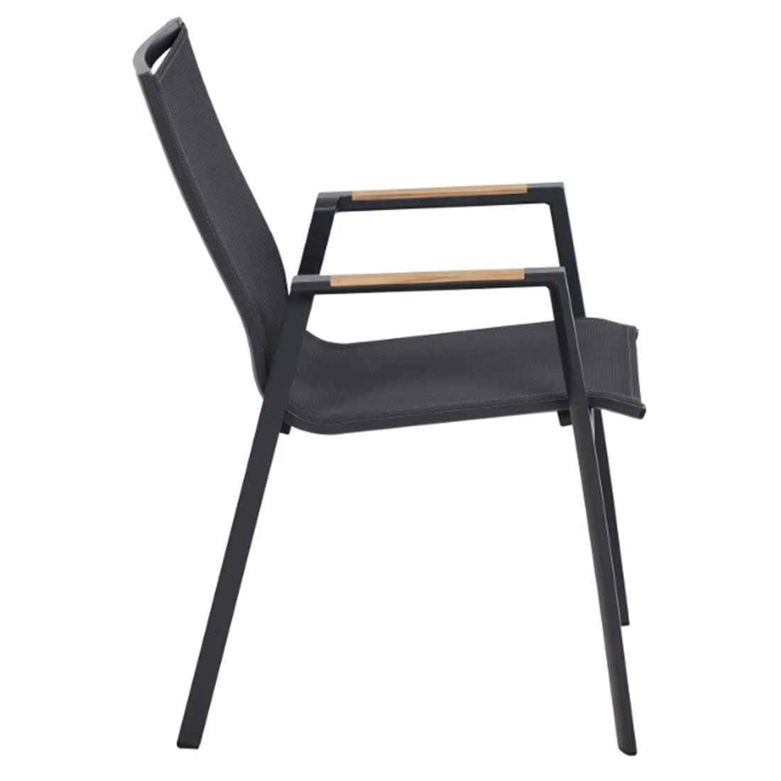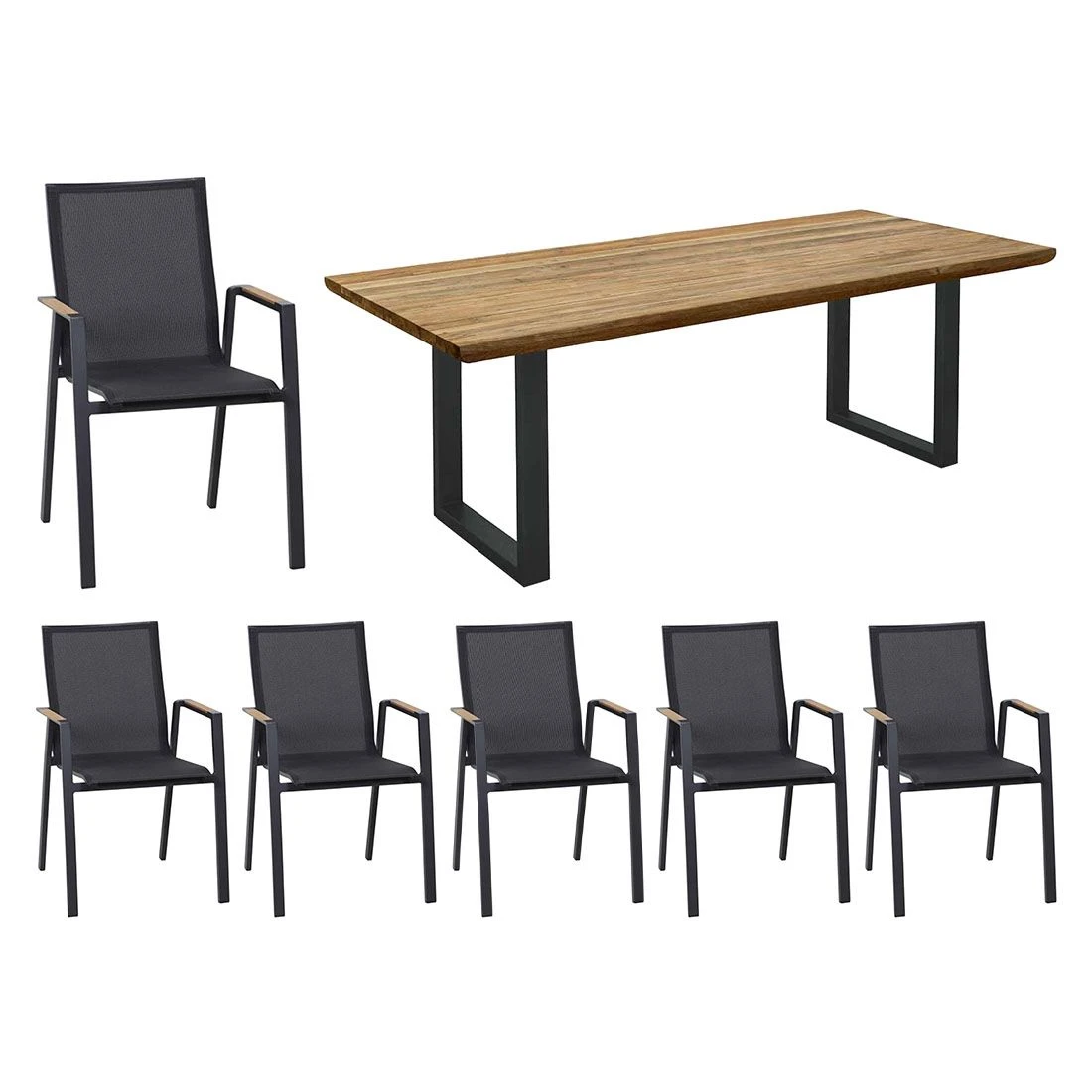 Das Gestell ist aus Aluminium gefertigt. Dadurch lassen sich die Möbel leicht von einem Standort zum nächsten transportieren und sind dennoch sehr stabil. Optisch ansprechend ist die Farbgebung der Gestelle in Anthrazit. Die Farbgebung der Sitzfläche ist Grau. Zum Lieferumfang des Sets gehört auch ein praktischer Tisch. Die Gebrauchsspuren in der Tischplatte sind Teil der Formensprache der Tischplatte. Denn diese ist aus wiederverwertetem Teak gearbeitet, das zuvor aus alten Hütten und Booten gewonnen wurde. Bei der Aufarbeitung werden dann Einkerbungen, Nagellöcher und Co. bewusst erhalten. Jede Tischplatte und damit jeder Gartentisch ist also ein Unikat. Die Tischplatte ist Natur. Als klassische Design-Komponente fungiert das geradlinige Vierfußgestell. Der Tisch ist klassisch rechteckig gestaltet.