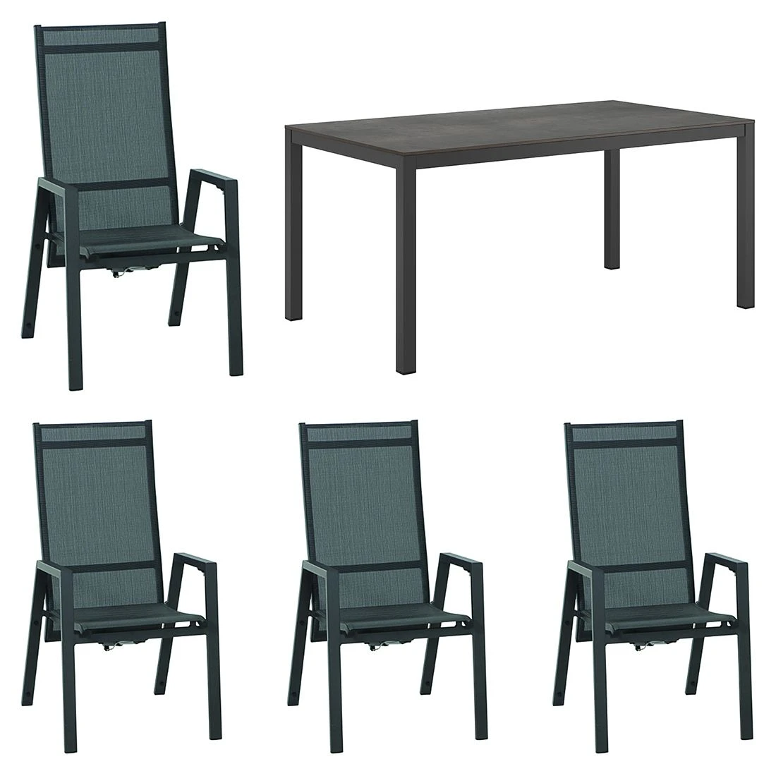 Die robusten Metallgestelle aus Aluminium sind pflegeleicht und garantieren gleichzeitig eine hohe Stabilität. Darüber hinaus gewährleistet dieses leichte Material, dass Sie die Möbel bequem transportieren können. Optisch ansprechend ist die Farbgebung der Gestelle in Anthrazit. Die Farbgebung der Sitzfläche ist Silber-Schwarz. Zum Lieferumfang des Sets gehört auch ein praktischer Tisch. Dessen robuste Tischplatte aus pflegeleichtem HPL-Kunststoffverbund ist gerade für den Einsatz im Freien und Mahlzeiten draußen besonders gut geeignet. Die Tischplatte ist Zement Dunkel. Als klassische Design-Komponente fungiert das geradlinige Vierfußgestell. Der Tisch ist klassisch rechteckig gestaltet.