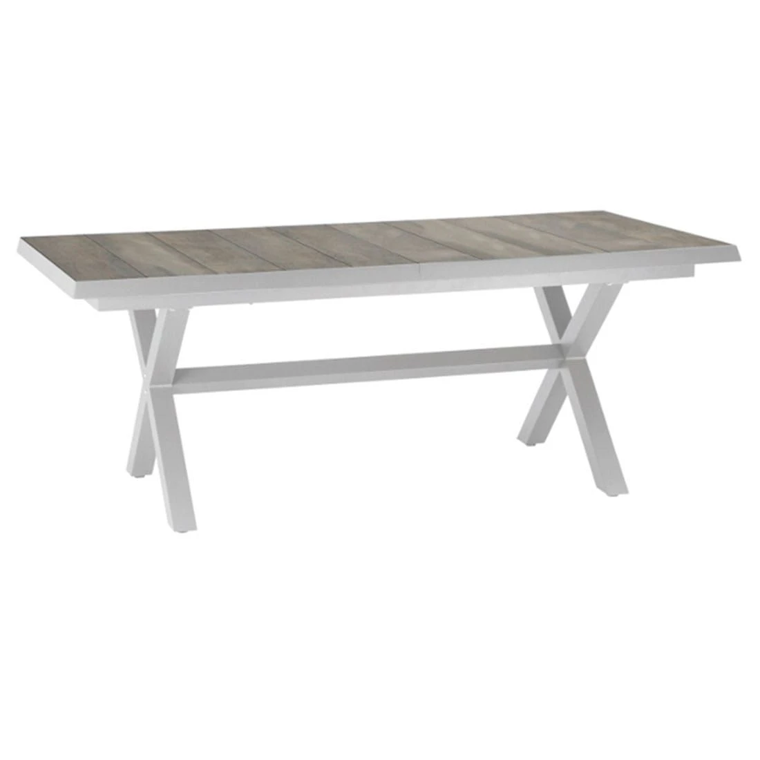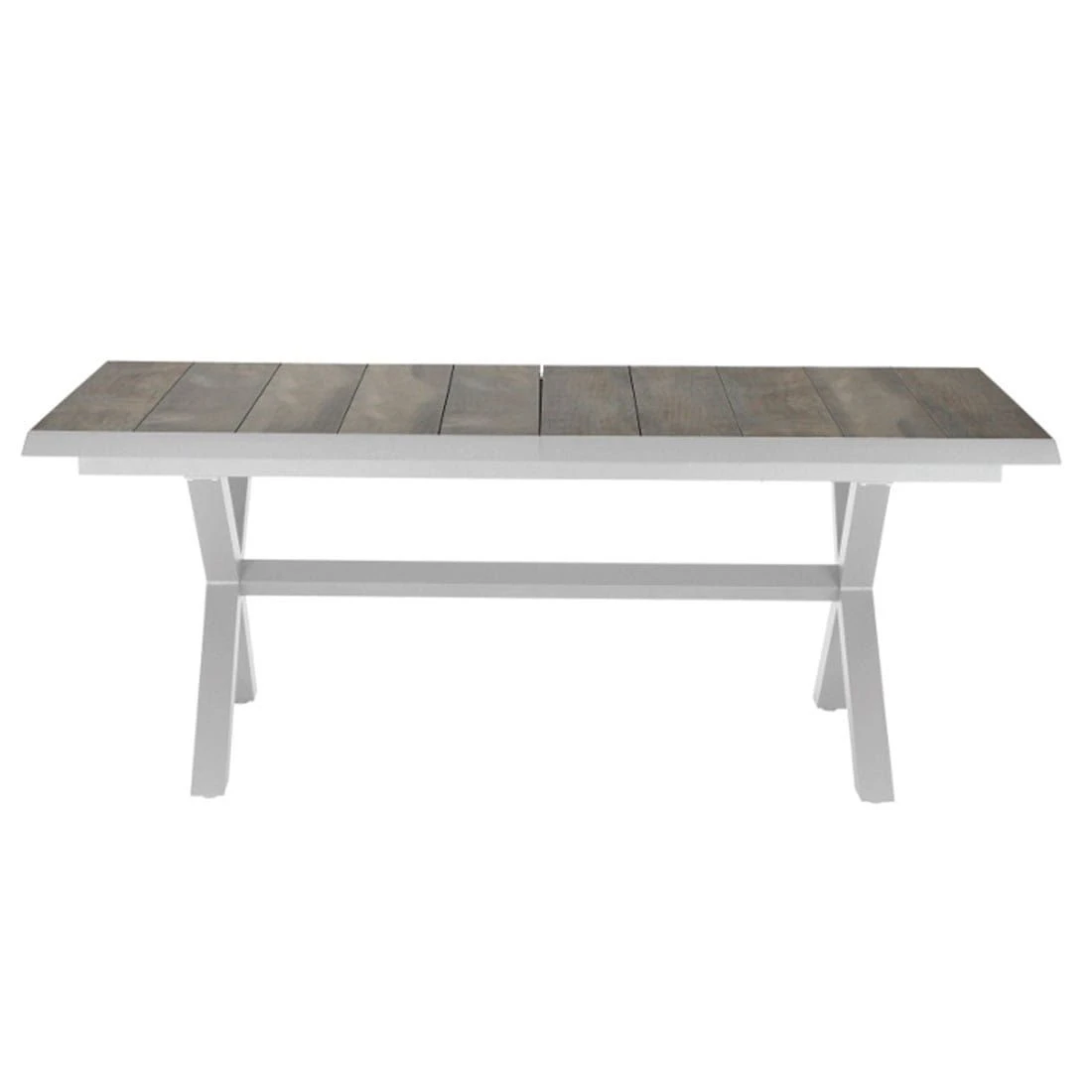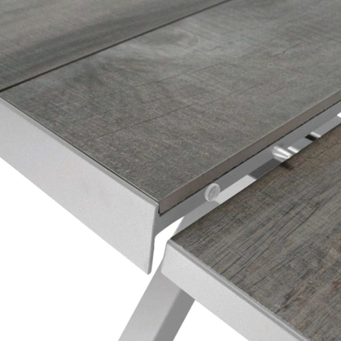 Als Material des Gestells dient wertiges Aluminium. Farblich ist das Gestell in Weiß-Grau matt gehalten. Für die Tischplatte wird hochwertiges Keramik verarbeitet, das im Garten eine angenehme Wohlfühl-Atmosphäre schafft. Für ein elegantes Gesamtbild erscheint die Platte in der Farbe Washed Grey. Die rechteckige Form ermöglicht es Ihnen, den Ausziehtisch in Ecken und an Häuserwänden platzsparend einzusetzen.