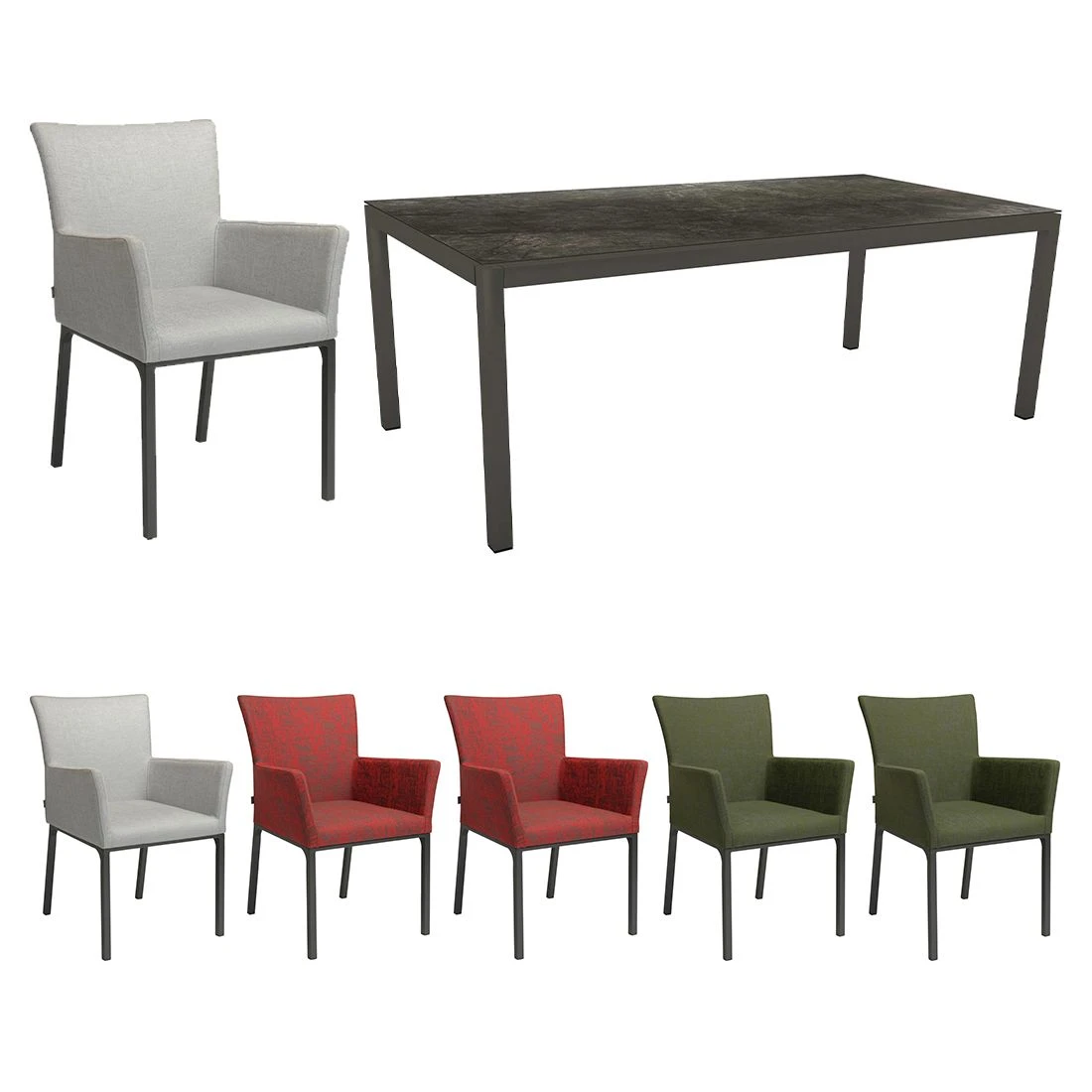 Das Gestell ist aus Aluminium gefertigt. Dadurch lassen sich die Möbel leicht von einem Standort zum nächsten transportieren und sind dennoch sehr stabil. Optisch ansprechend ist die Farbgebung der Gestelle in Anthrazit. Der Bezug ist aus robustem Outdoorstoff gefertigt, der Wind und Wetter gut standhält. Bei langen Feuchtigkeitsperioden empfehlen wir dennoch, für eine längere Haltbarkeit, eine Lagerung der abnehmbaren Kissen im Inneren. Farblich begeistern die Bezüge in elegantem Bunt. Im Set enthalten ist zudem ein Tisch. Die geschmackvolle HPL-Tischplatte ist nicht nur ein optischer Hingucker, sondern besitzt außerdem eine sehr widerstandsfähige und unbedingt kratzfeste Oberfläche, die einer Vielzahl von Belastungen trotzt. Als klassische Design-Komponente fungiert das geradlinige Vierfußgestell. Während die Farbe des Gestells Anthrazit ist, begeistert die Tischplatte in Dark Marble.