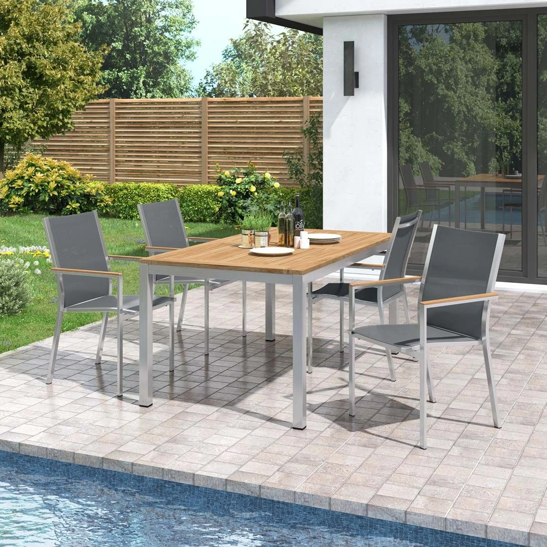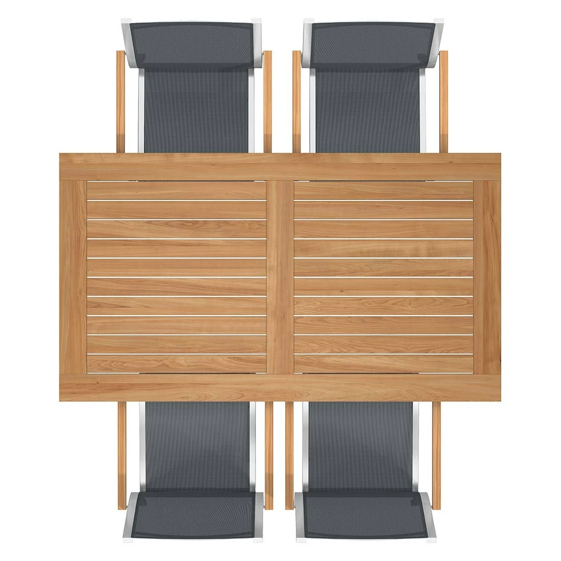 Im Preis des Sets ist ein passender Tisch enthalten. Teakholz ist besonders widerstandsfähig gegen Witterungseinflüsse wie Schwankungen in der Temperatur, Nässe und Trockenheit. Kein Wunder, dass dieses hochwertige Holz als Material für die Tischplatte verwendet wird.