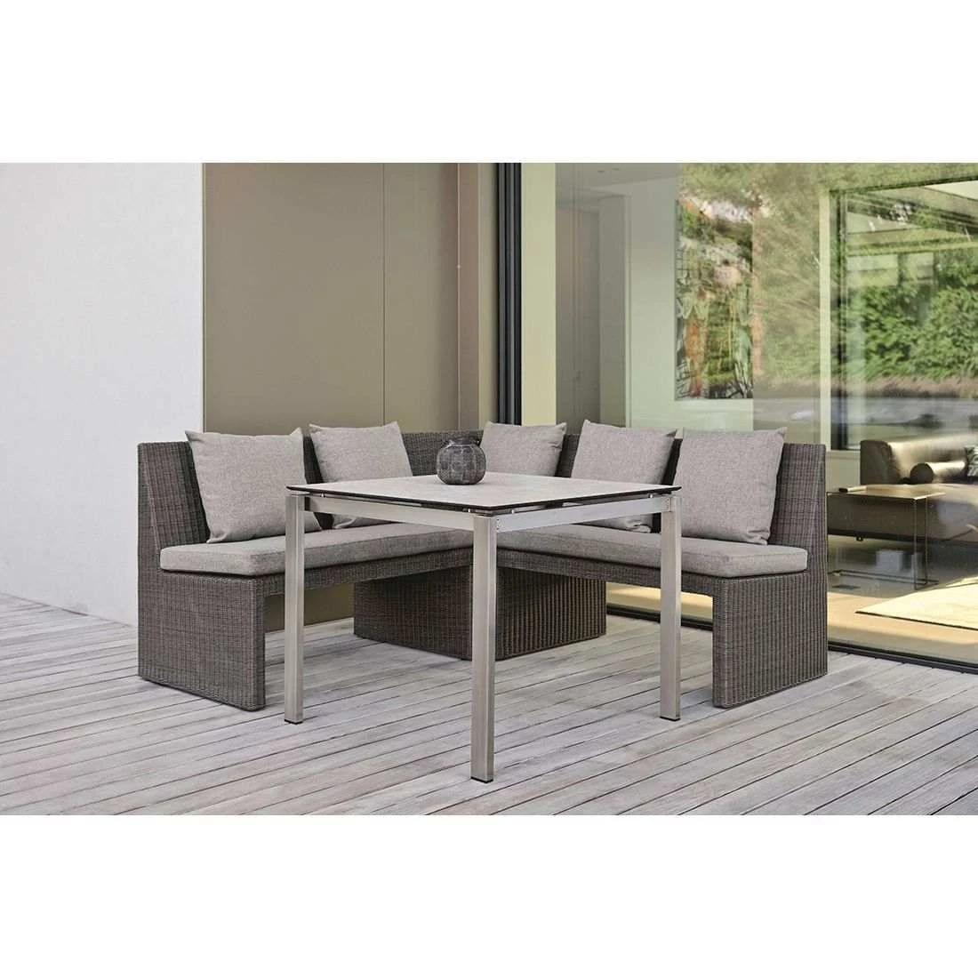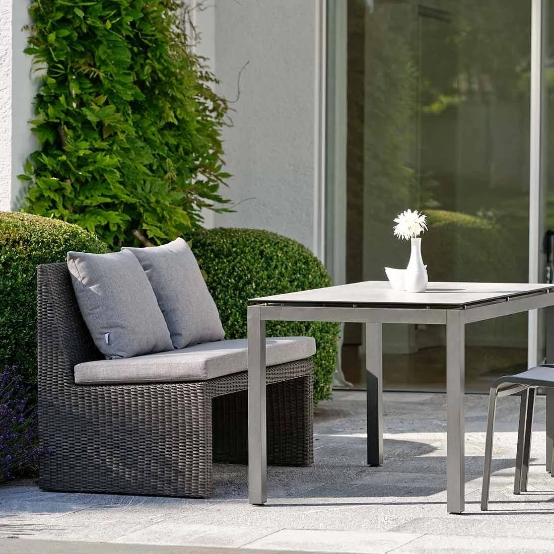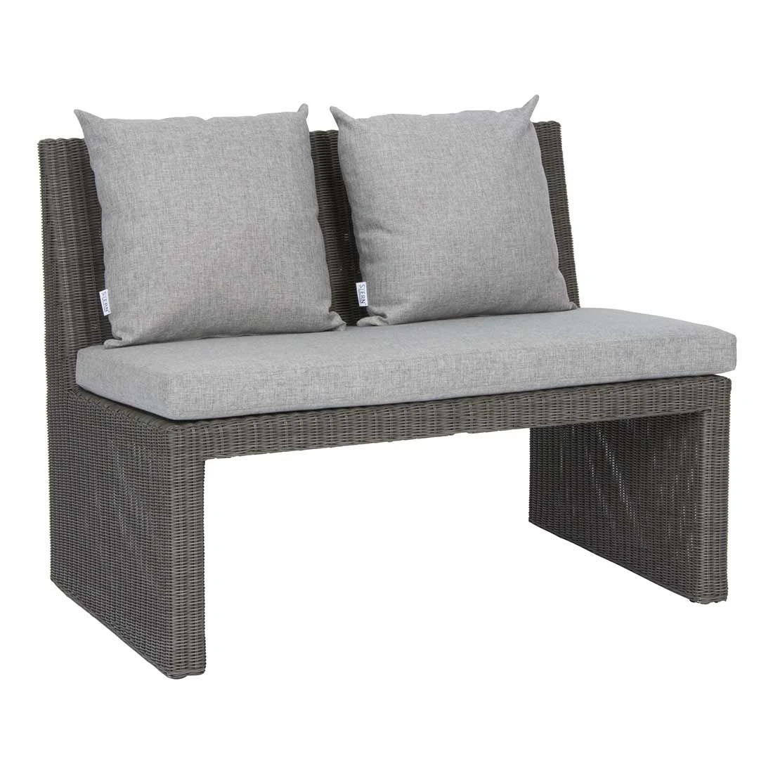 Das Gestell wird aus Aluminium gefertigt. Das geringe Eigengewicht des Materials macht die Gartenbank zu einem robusten, aber dennoch leicht zu transportierenden Sitzmöbel auf Ihrer Terrasse. Für eine attraktive Optik ist das Gestell im Farbton Basaltgrau gehalten. Das Gestell, das mit hochwertigem Polyrattan-Geflecht umflochten ist, bringt ein natürliches Flair auf die Terrasse. Damit die Gartenbank optisch ansprechend ist, sind die Sitzfläche und der Bezug im Farbton Seidengrau gehalten.