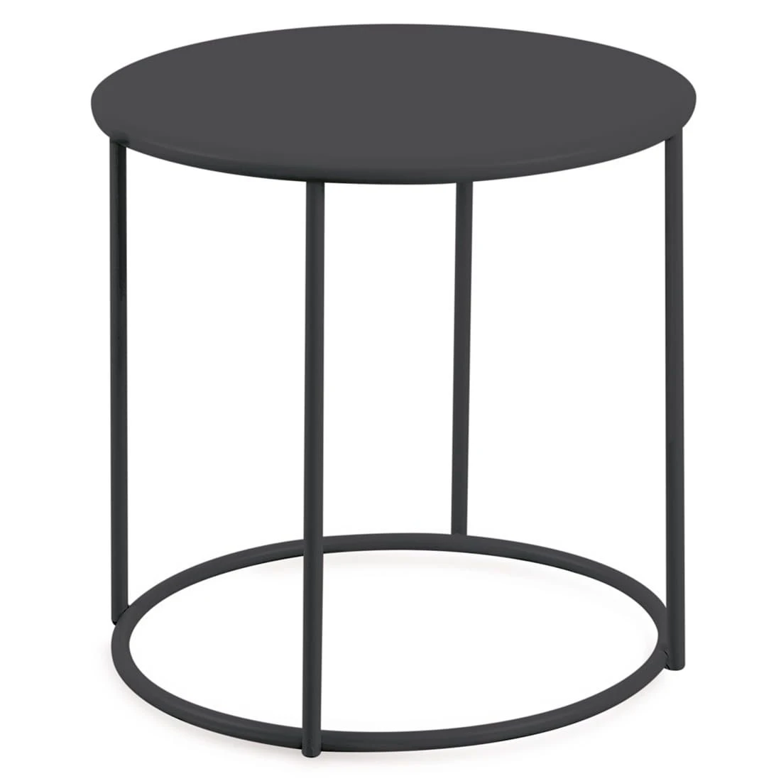 Sowohl die Tischplatte als auch das Gestell sind aus Stahl (beschichtet) gefertigt. Farblich ist die Platte in Schwarz gehalten. Die Form des Beistelltischs ist rund.