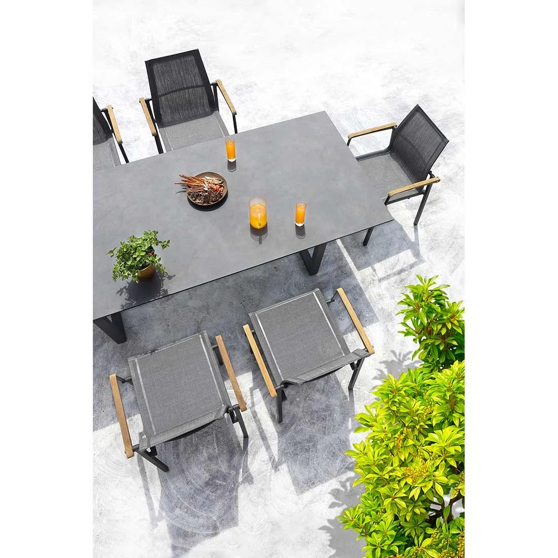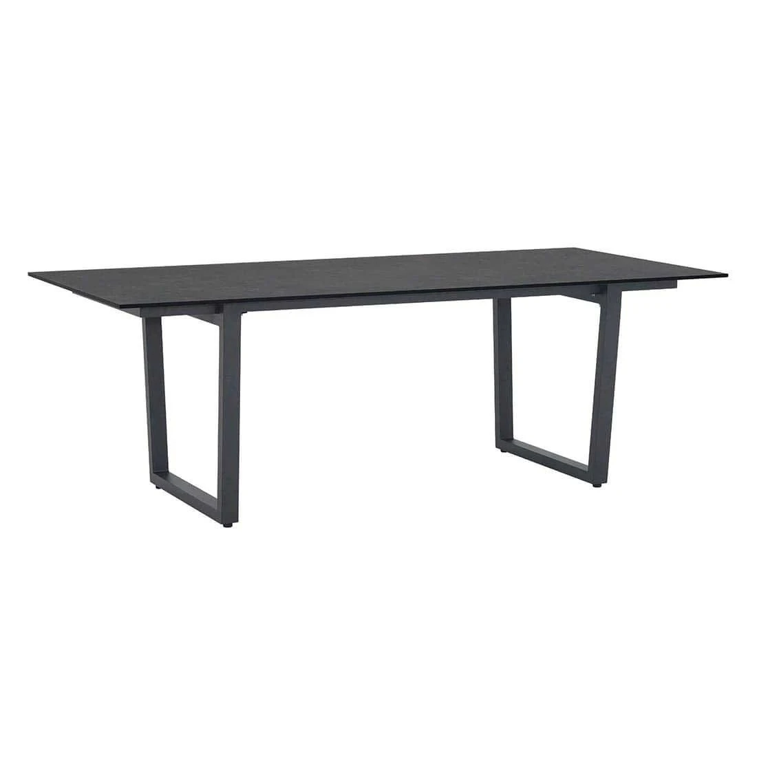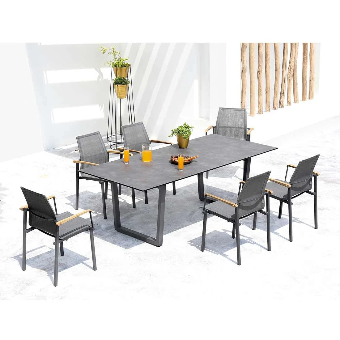Das Gestell ist aus Aluminium gefertigt. Dadurch lassen sich die Möbel leicht von einem Standort zum nächsten transportieren und sind dennoch sehr stabil. Optisch ansprechend ist die Farbgebung der Gestelle in Graphit. Im Set enthalten ist zudem ein Tisch. Die schöne HPL-Tischplatte ist nicht nur ein optischer Hingucker, sondern besitzt zusätzlich eine sehr widerstandsfähige und unbedingt kratzfeste Oberfläche, die jeglichen Belastungen trotzt. Die Tischplatte ist Steingrau. Der moderne Look des Gartenmöbel-Sets wird durch die attraktiven Kufen nochmals betont. Die Form des Tisches ist klassisch rechteckig gestaltet.