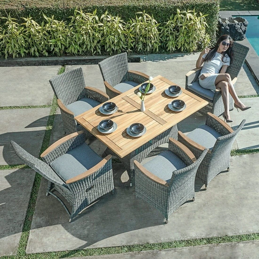 Im Preis des Sets ist ein passender Tisch enthalten. Teak ist extrem widerstandsfähig gegen Witterungseinflüsse wie Temperaturschwankungen, Nässe und Trockenheit. Kein Wunder, dass dieses hochwertige Holz als Material für die Tischplatte verwendet wird. Das Design des Tisches ist klassisch rechteckig gehalten.